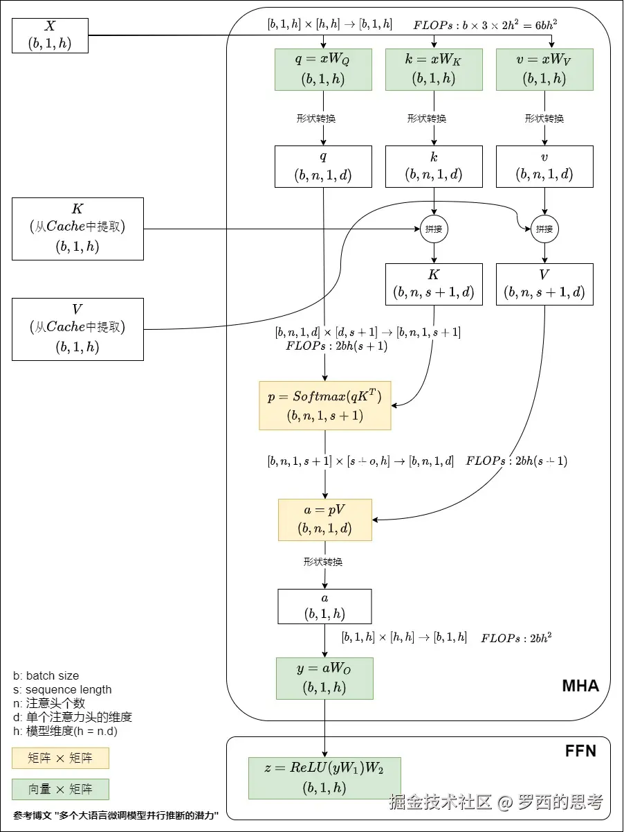 算力并不能说明一切,模型还需要访问 GPU 内存,内存带宽也可能成为瓶颈。因为需要把参数从内存里面读出来吧?内存访问量 = 参数数量 * 2 bytes。针对内存带宽部分,大语言模型中的计算具备一些鲜明的特点。我们一一进行分析。