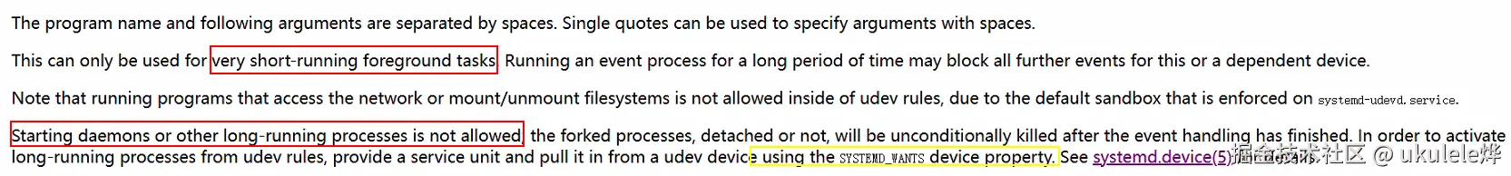 查看官方说法(udev),寻觅到 RUN 参数的阐释,能够目睹如下的描述内容,表明 udev 仅能运行能够迅速执行的命令,耗时长久的命令将会在 udev 事件终结之际被终止。