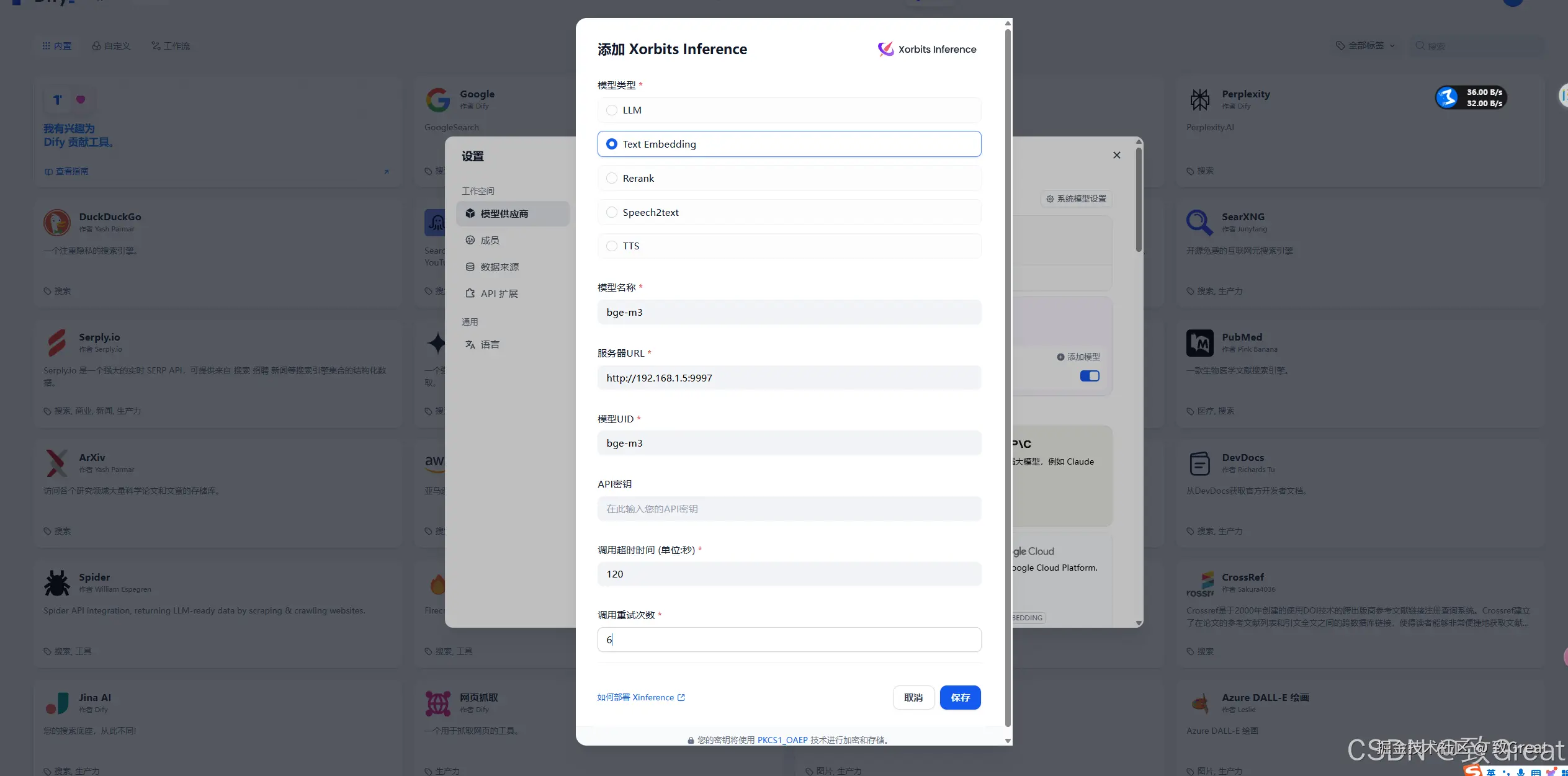 docker run- 启动一个新的Docker容器--name xinference- 将容器命名为"xinference"-d- 以分离(后台)模式运行容器-p 9997:9997- 将容器的9997端口映射到主机的9997端口-e XINFERENCE_HOME=/data- 设置环境变量,指定Xinference的主目录为容器内的/data-v $(pwd):/data- 将当前工作目录挂载到容器内的/data目录,实现数据持久化--gpus all- 允许容器使用主机上的所有GPU资源xprobe/xinference:latest- 使用最新版本的xprobe/xinference镜像xinference-local -H 0.0.0.0- 在容器内运行xinference-local命令,并设置主机地址为0.0.0.0(允许从任何IP地址访问)