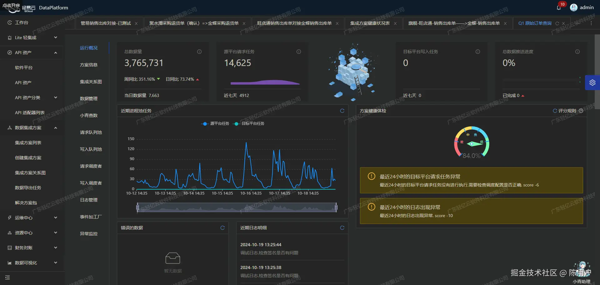 为了确保整个集成过程顺利进行,需要实时监控任务状态和性能。一旦发现异常情况(如网络超时、API限流等),应及时采取措施,如重试机制或告警通知。此外,还可以通过日志记录功能跟踪每个步骤的执行情况,为后续排查问题提供依据。