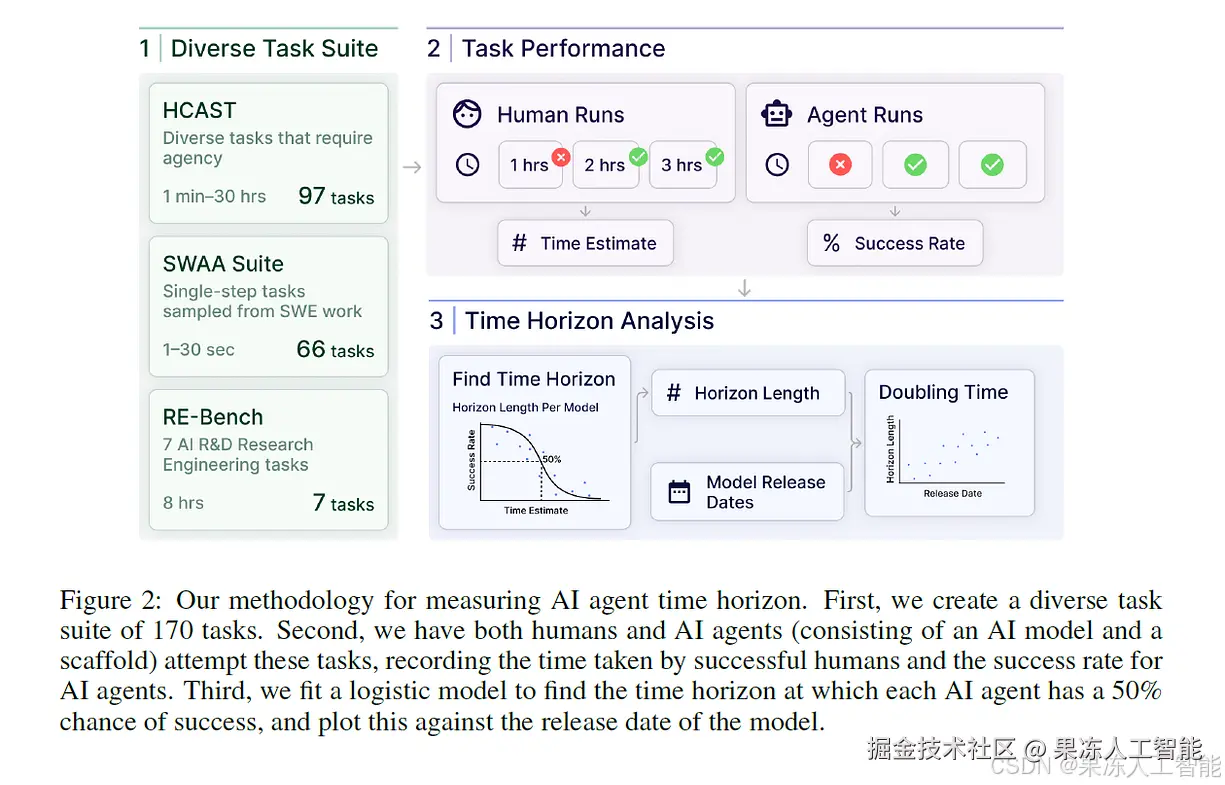 上面这张研究图展示了他们是如何测量 AI 代理的时间范围的:
