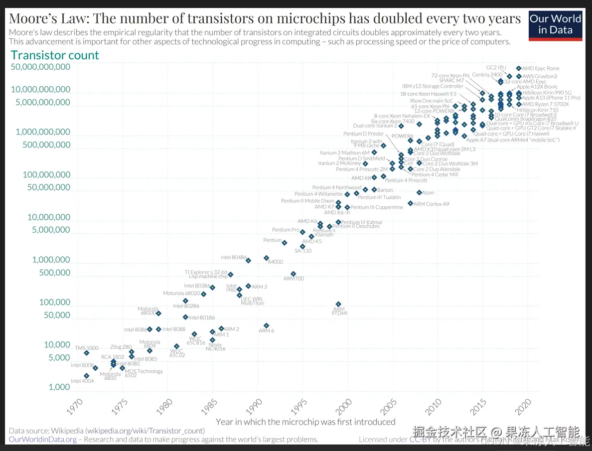 1965 年,Intel 的联合创始人戈登·E·摩尔做出了一个大胆的观察:微芯片上的晶体管数量大约每两年翻一倍。这后来被称为摩尔定律,虽然它不是物理定律,但却是科技进步中一个惊人一致的趋势。