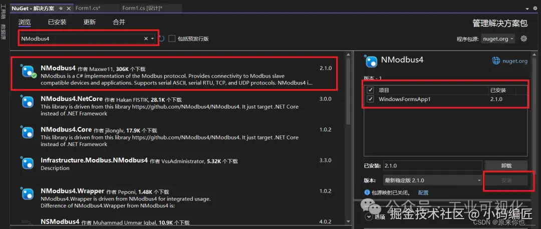 安装方式也超简单,直接通过NuGet搜索NModbus4,选择最新版(如2.1.0),一键安装即可完成集成,更加降低了上手门槛。