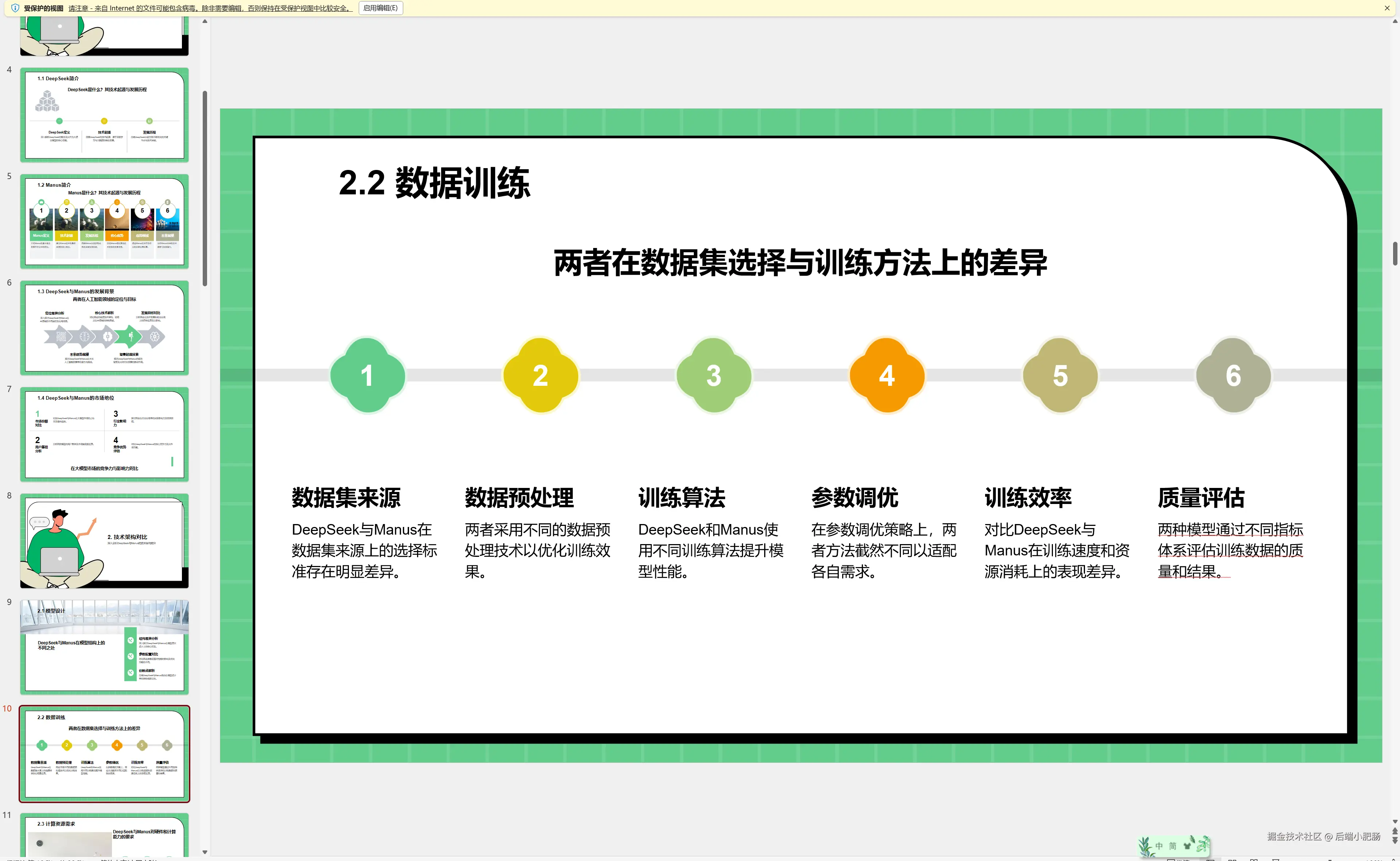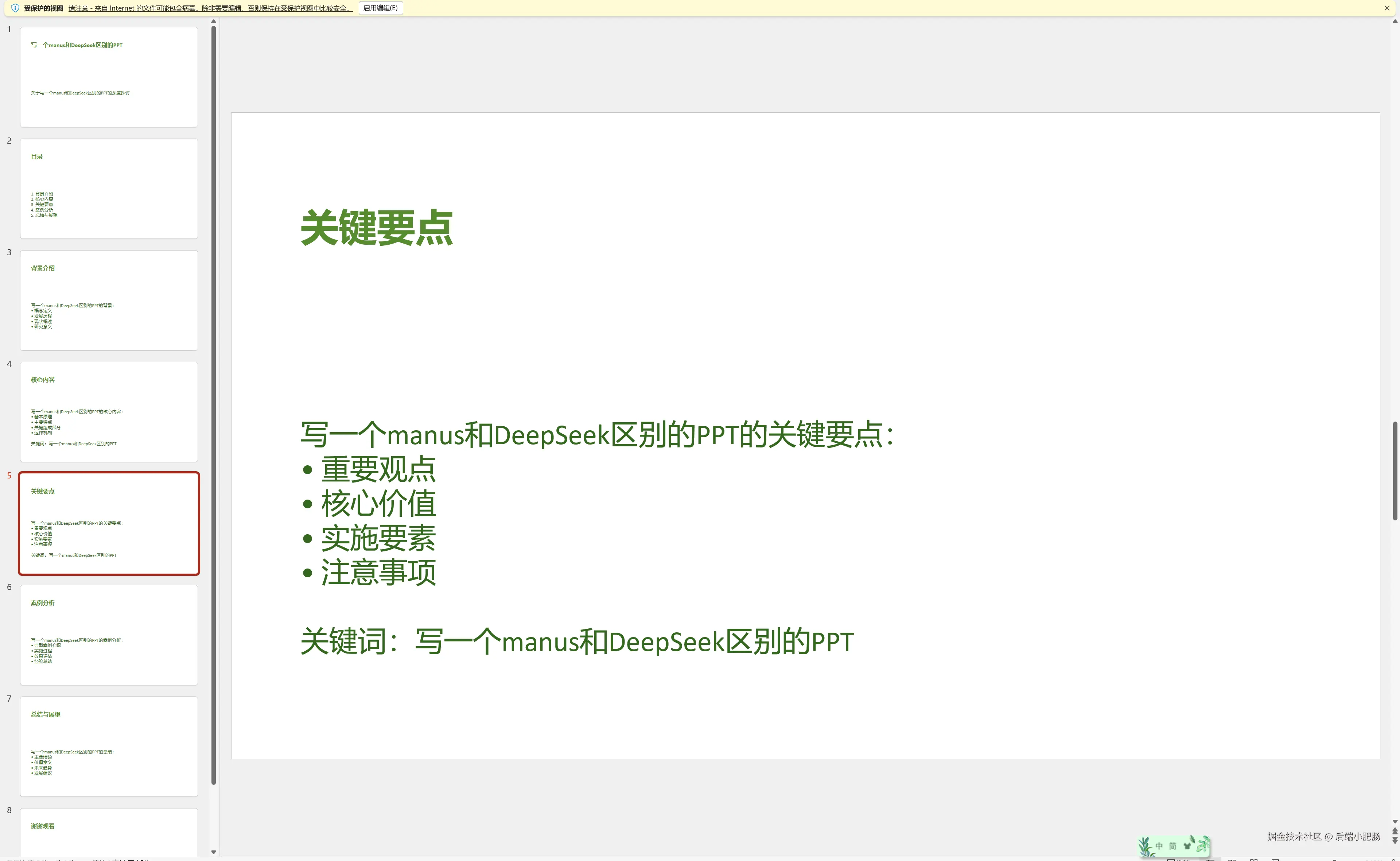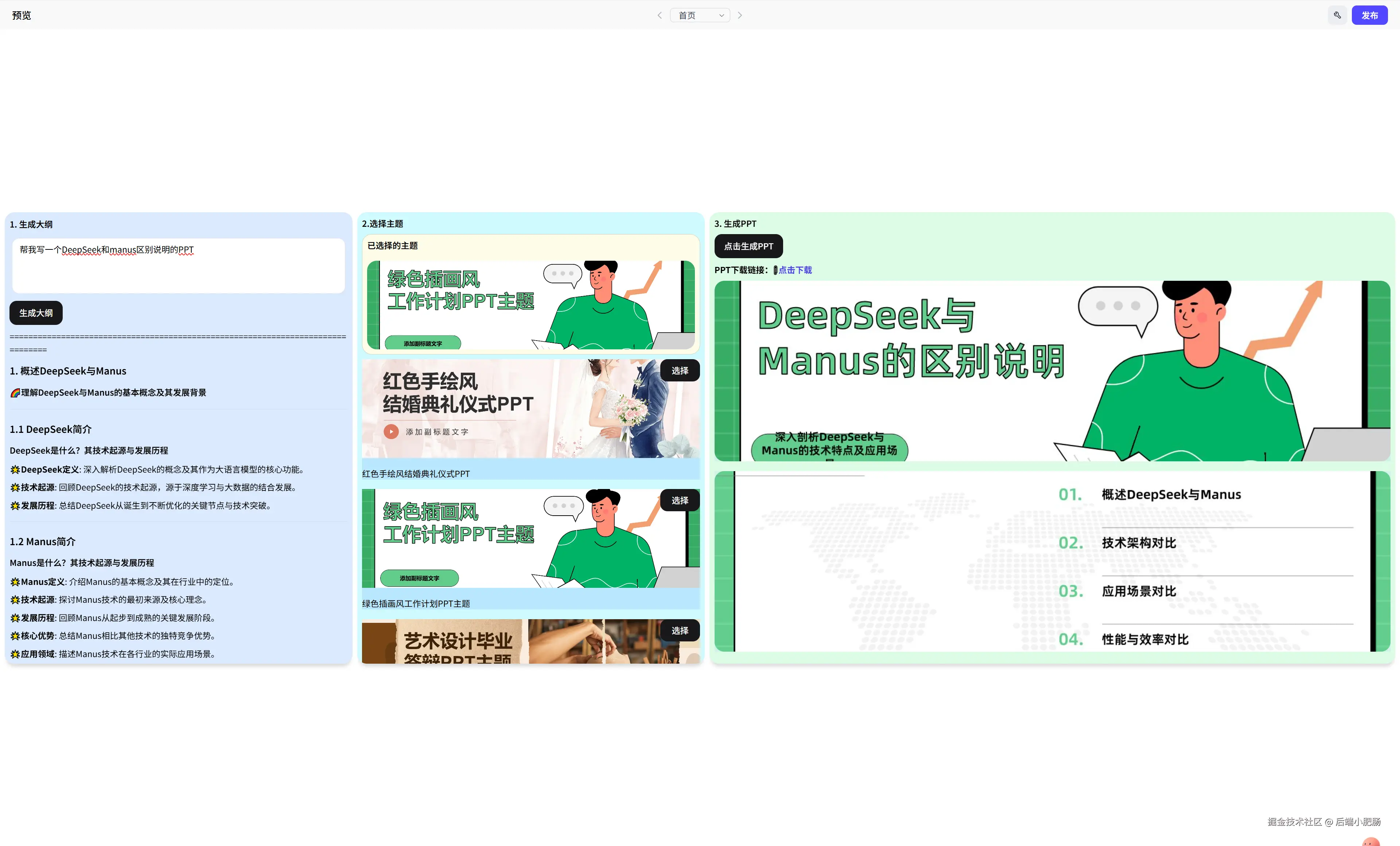 我还是让它帮我写一个DeepSeek和manus区别说明的PPT: