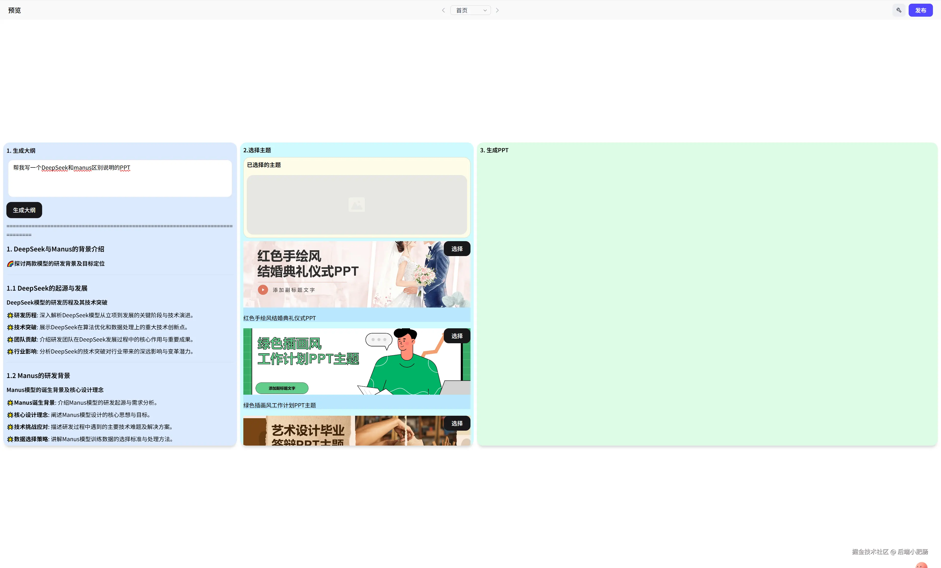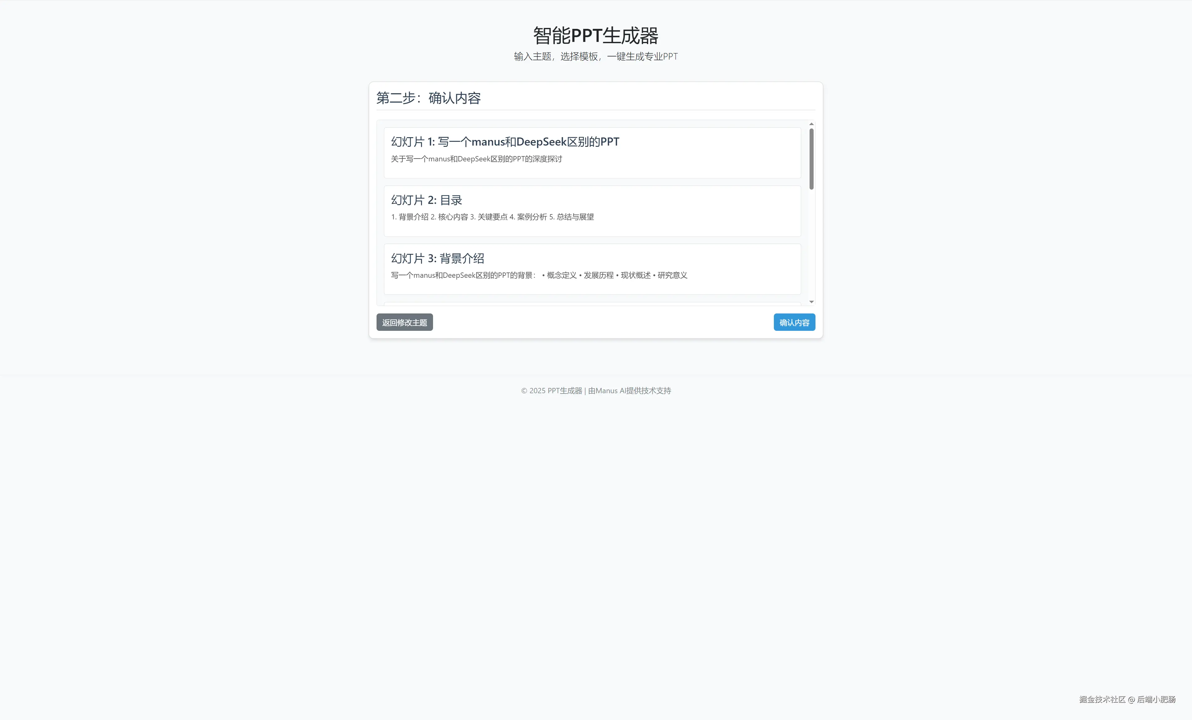 点击链接进去,确实是一个PPT生成器,我测试了一下,输入PPT主题(让它帮我写一个DeepSeek和Manus区别说明的PPT)以后点击了【生成内容】: