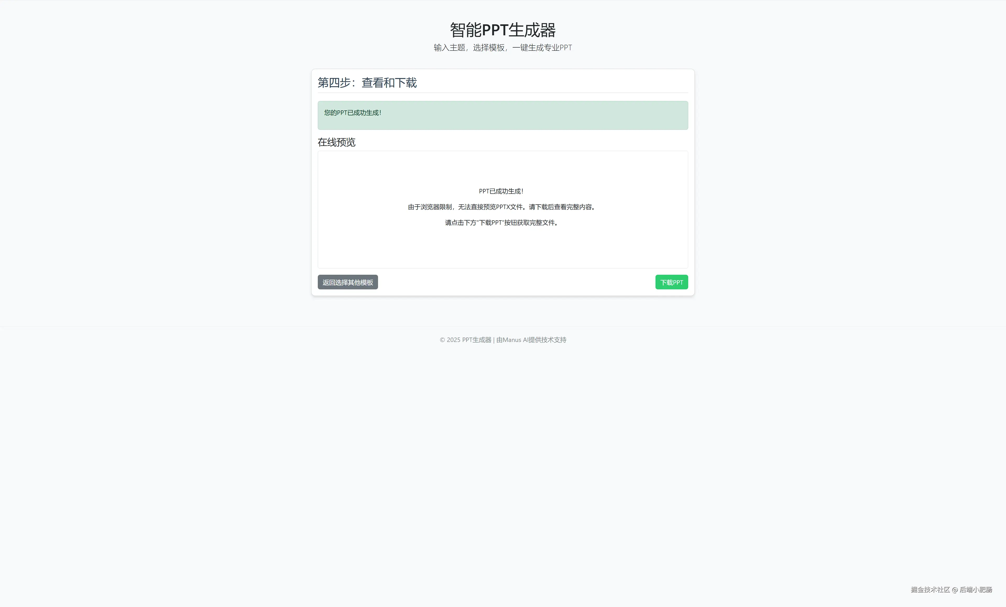 选择完主题后,点击上图的【生成PPT】,就能获取PPT了,这里有一个问题,他没有实现在线预览成品PPT的功能: