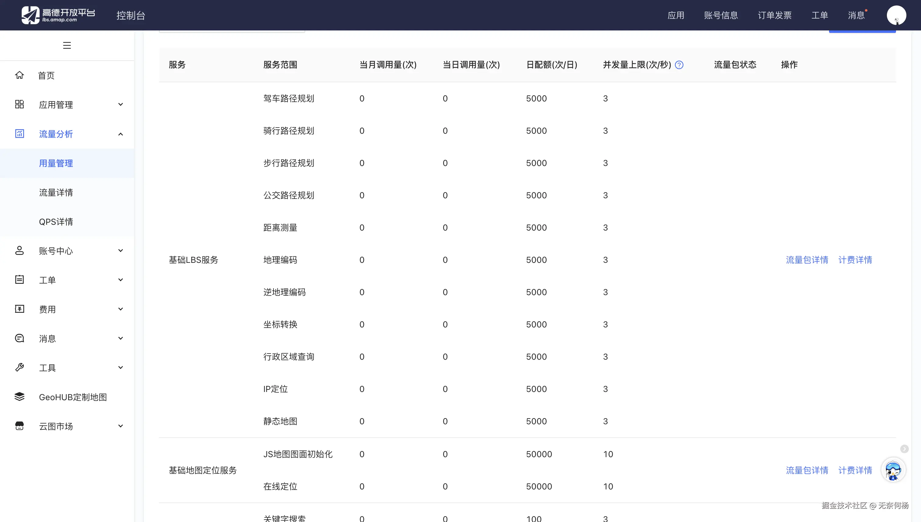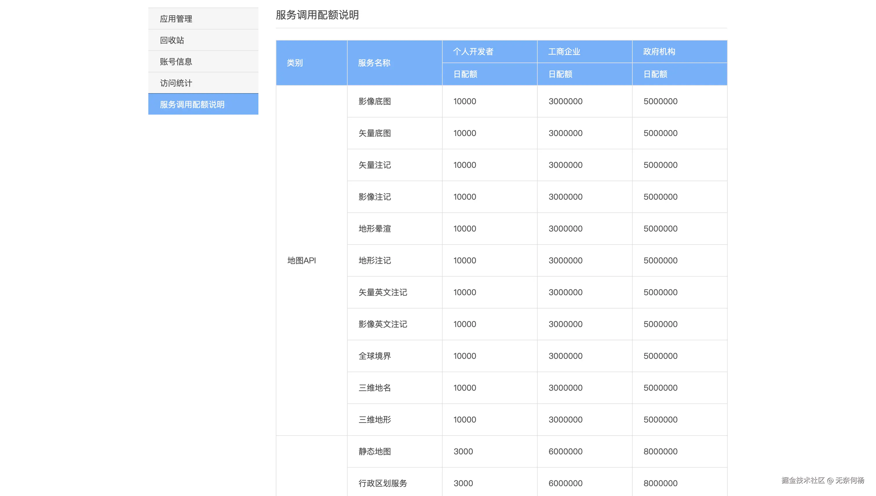 如在高德开发平台(天地图也是按应用分的),会以应用纬度再划分,同时服务是多种的。据此可以抽象供应商(供应商id、供应商名称、应用、应用密钥、合同编号、合同其他信息等等)。
