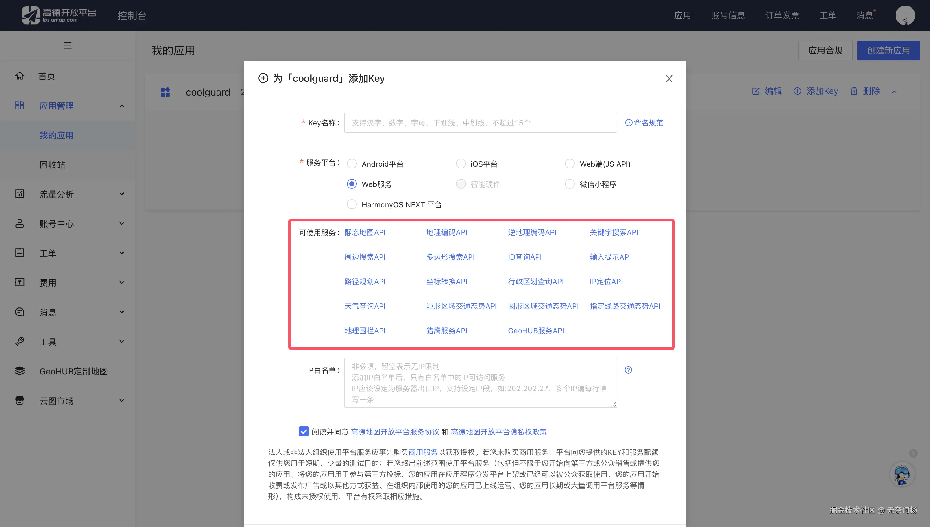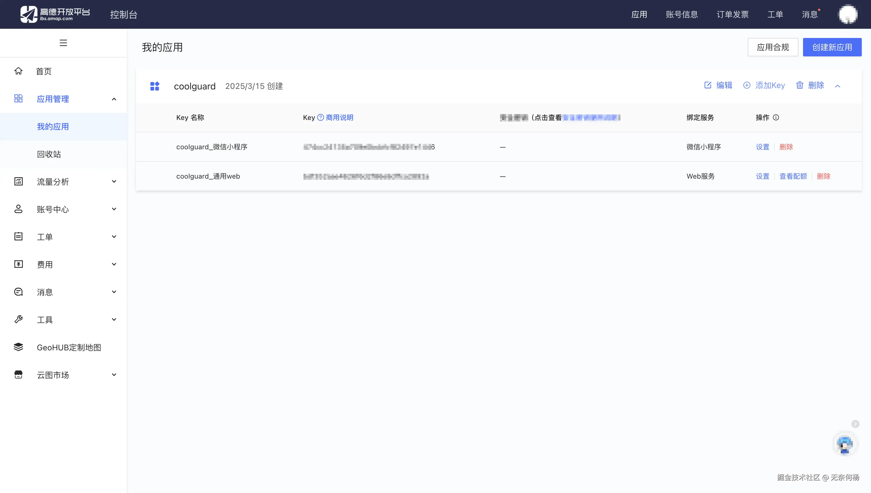供应商对多个应用,高德和天地图是一致的,但是下面服务就不一致了,天地图所有服务密钥就是应用密钥,高德是应用下新建服务后服务密钥是独立的。