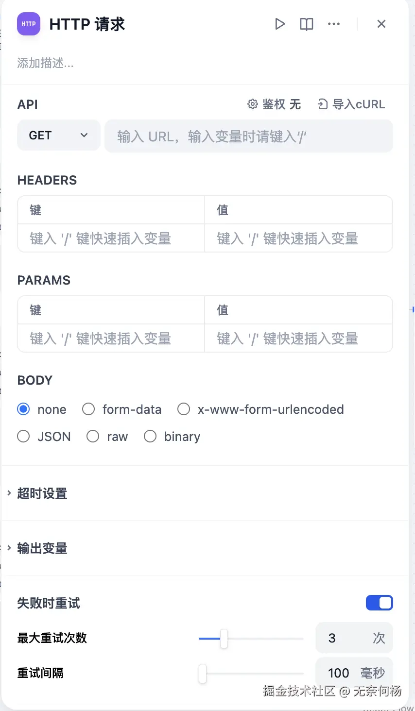 | body_template | JSON | 请求体模板(支持变量插值) |