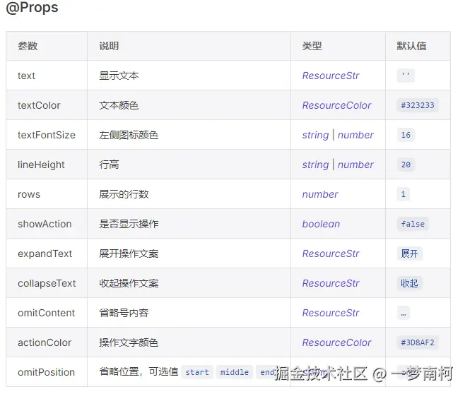 text:要显示的文本内容。textFontSize:文字大小,默认使用全局样式的中等字体大小。textColor:文字颜色,默认是组件定义的颜色。lineHeight:行高,默认值为 20px。rows:展示的行数,默认为 1 行。showAction:是否显示“展开/收起”按钮。expandText和collapseText:分别是“展开”和“收起”的文案。omitContent:省略号的内容,默认是“…”。actionColor:操作按钮的文字颜色,默认是全局样式的主色。omitPosition:省略位置,可选值为 "start"(开头省略)、"middle"(中间省略)、"end"(结尾省略),默认是 "end"。