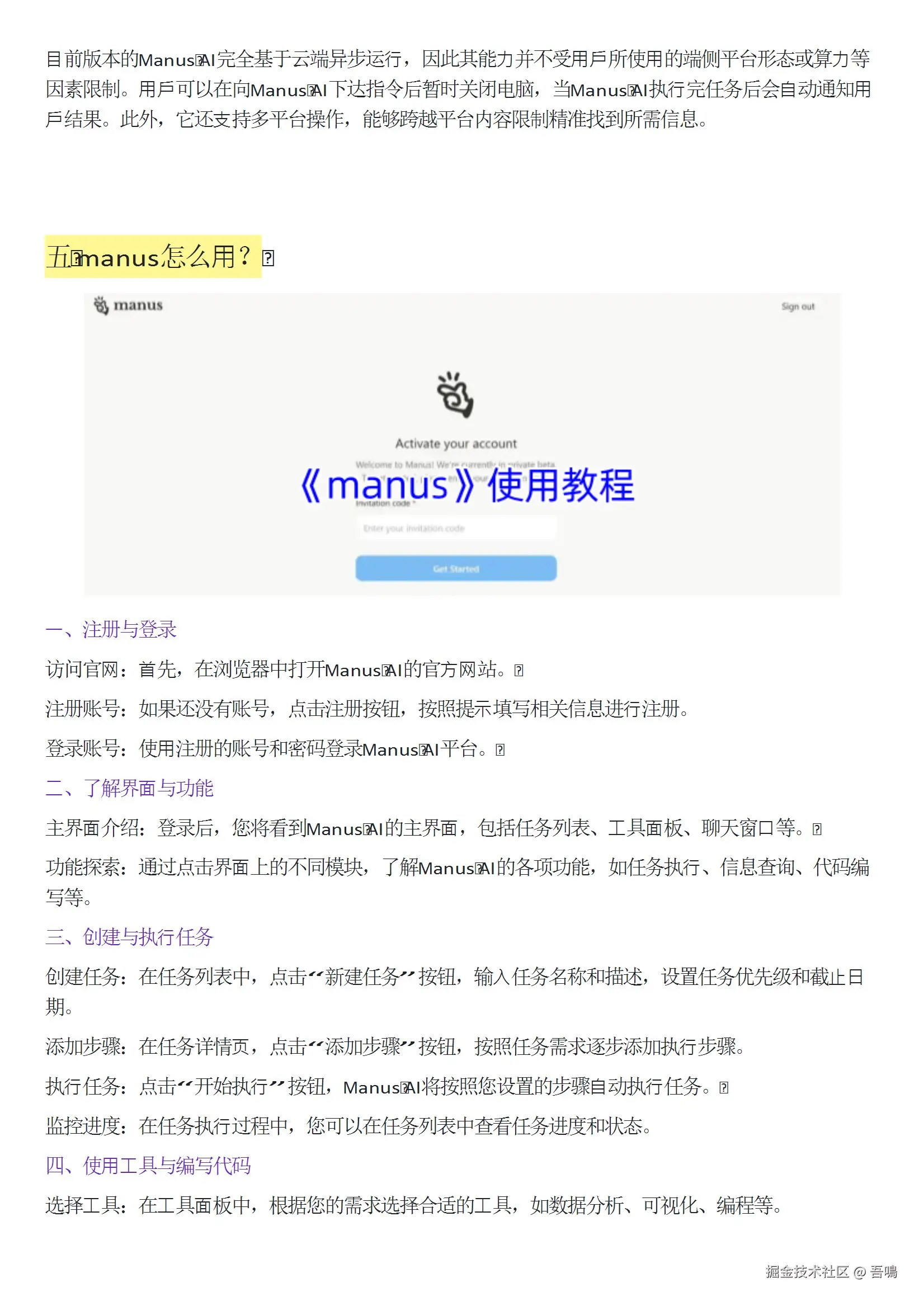吾鳴今天要给大家分享的一份比较全面详细的Manus学习手册,该学习手册主要包含Manus产品概述与核心理念、Manus功能与使用场景、Manus技术架构与工作流、Manus案例库与用户实践、邀请码获取与内测信息、Manus与传统AI对比与优势、用户评价与社区生态和未来发展方向与优化方向几大部分组成。PDF一共57页,是目前网络上较为全面系统的Manus教程,文末有完整版下载地址,需要的朋友可自行下载。