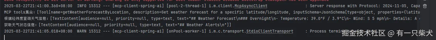 从打印的信息可以看出,成功获取到了我们通过@Tool注解的两个MCP Server的工具,同时也成功查询到了当地的气象信息。就是这么简单。