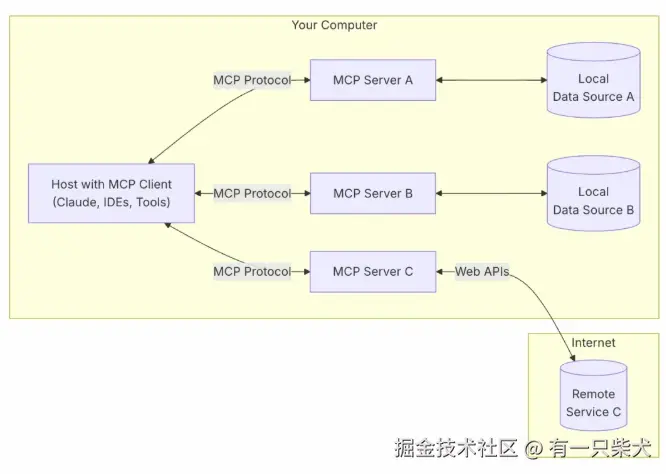 - 本地数据源: 部署在用户本地环境中的数据资源,例如本机文件系统、数据库、应用服务等。MCP服务器可以受控地访问这些资源,并将内容提供给AI模型使用。例如,一个本地MCP服务器可以读取电脑文件或查询本地SQLite数据库,然后将结果发给模型作为参考。