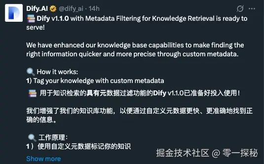 Dify 1.1.0版本算是一次不大不小的更新,但带来的改进确实解决了不少实际问题。但是缺憾就是 知识检索的元数据过滤功能存在bug ....