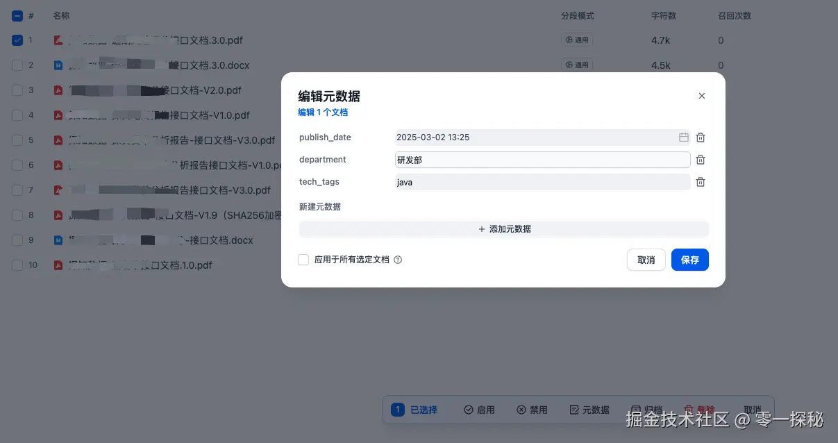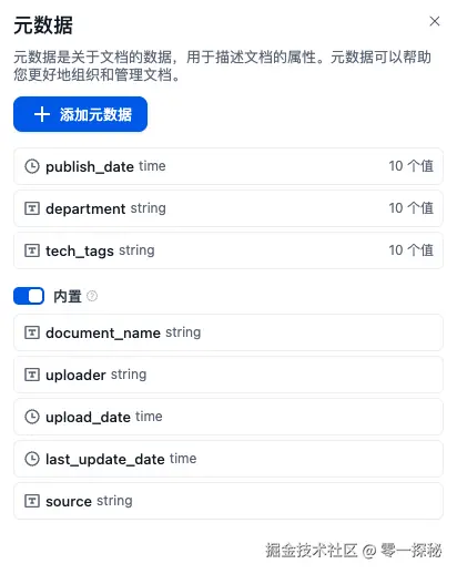 - 添加元数据字段 首先在知识库设置中添加自定义元数据字段。我添加了"部门"(department)、"发布日期"(publish_date)和"技术标签"(tech_tags)三个字段。