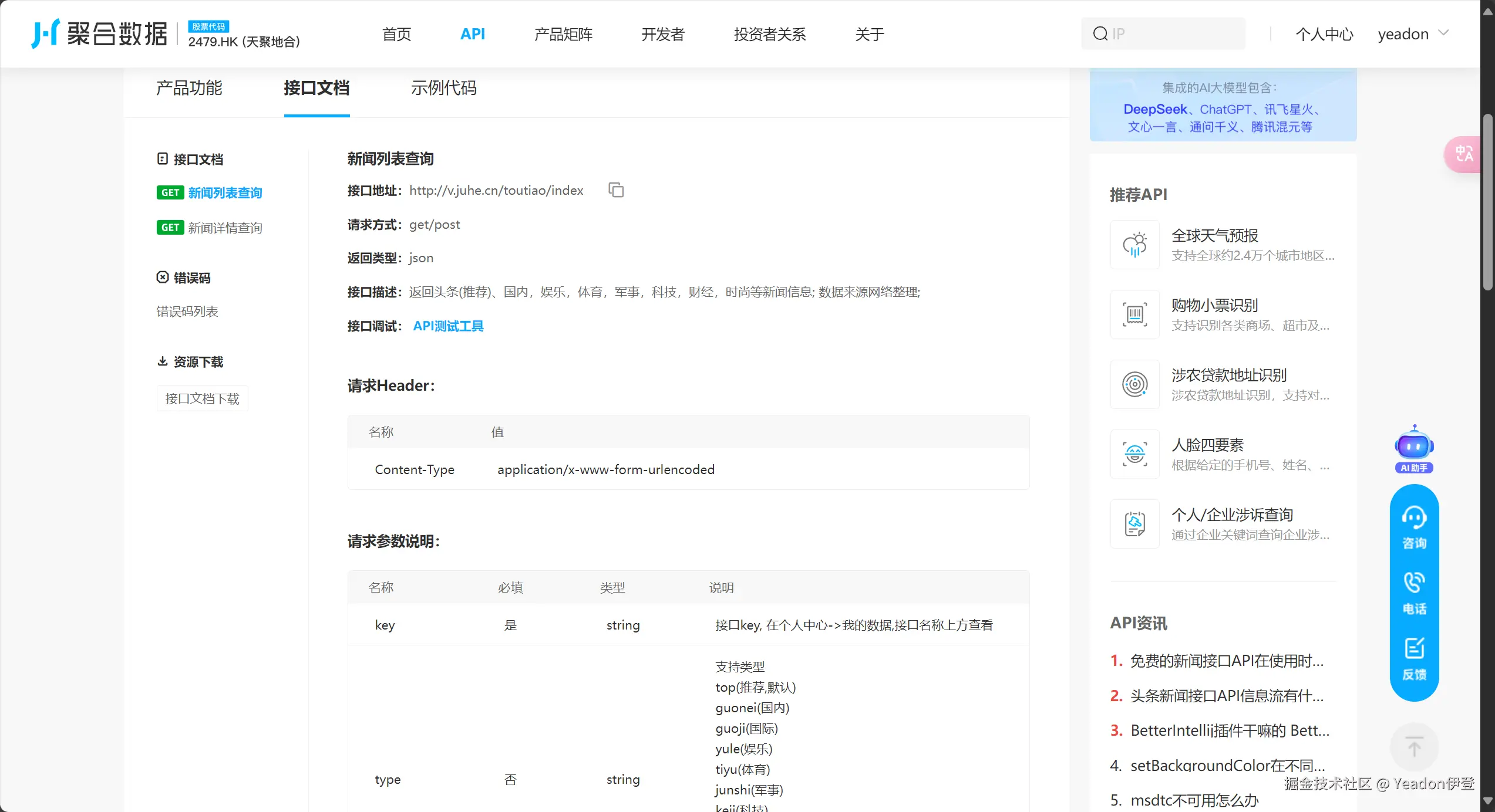 注册登录后, 在API市场搜索 “新闻头条”, 选择 “免费调用”! 每天50次免费额度, 完全够用! 点击 “接口文档”, 仔细阅读, 这里藏着 接口地址、请求方式、参数说明 等重要信息, 划重点! 后面要用到!