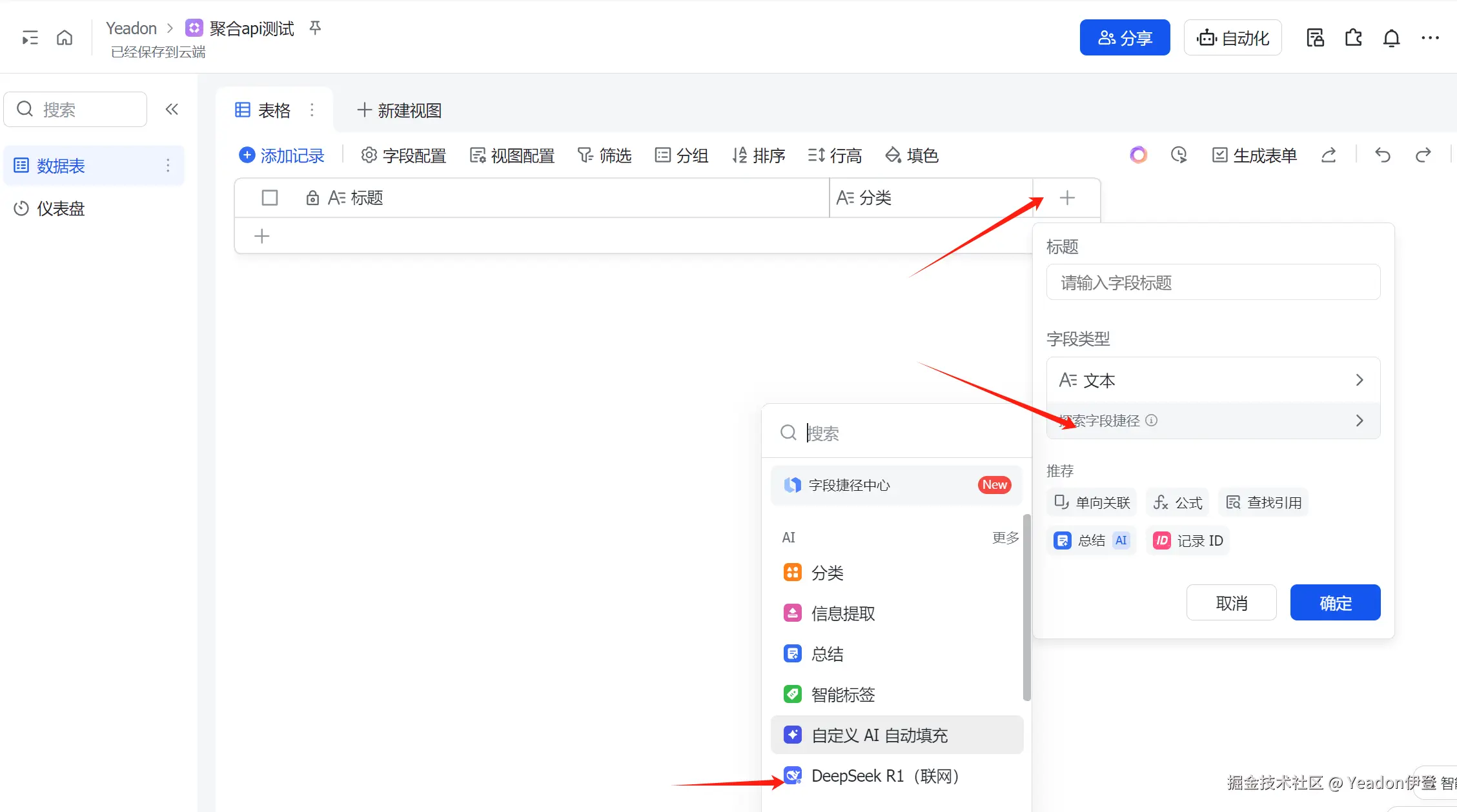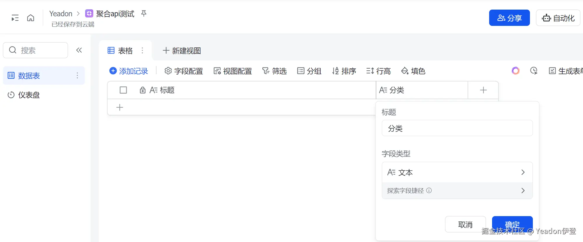 最后一步! 把新闻数据放进飞书多维表格! 在飞书中 新建多维表格, 务必创建 “标题” 和 “分类” 两个文本字段 (重要!和代码节点对应)。 创建完成后, 复制多维表格链接。