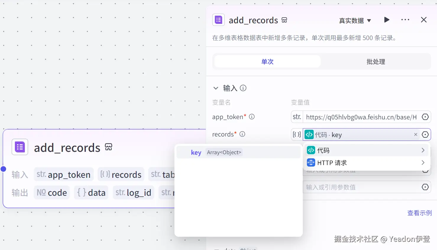 回到Coze工作流, 拖入 “飞书多维表格” 节点, 粘贴刚才复制的 多维表格链接, “Records” 选择 “代码节点” 的 “对象数组输出”。