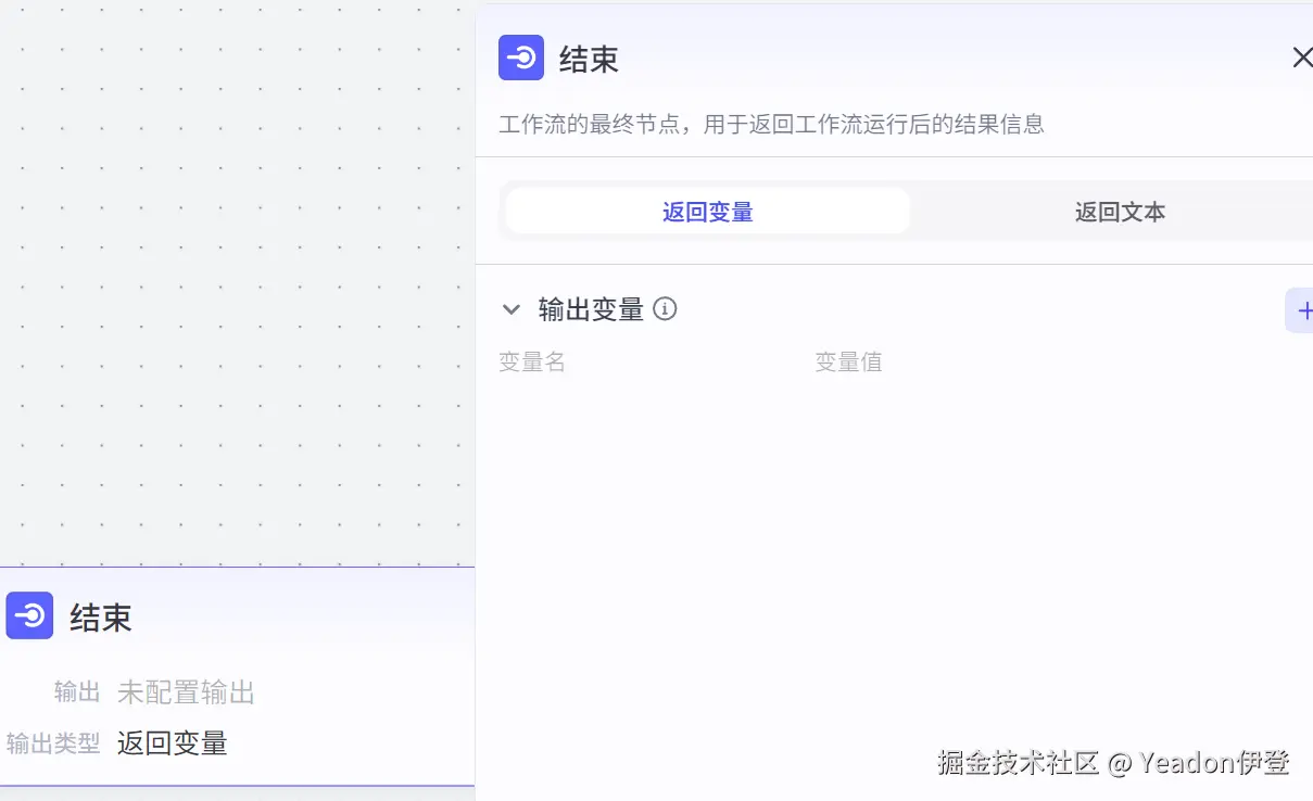 最后的输出节点可以把输出变量都删除了,因为我们的输出放到飞书多维表格了不需要在扣子上做多余输出