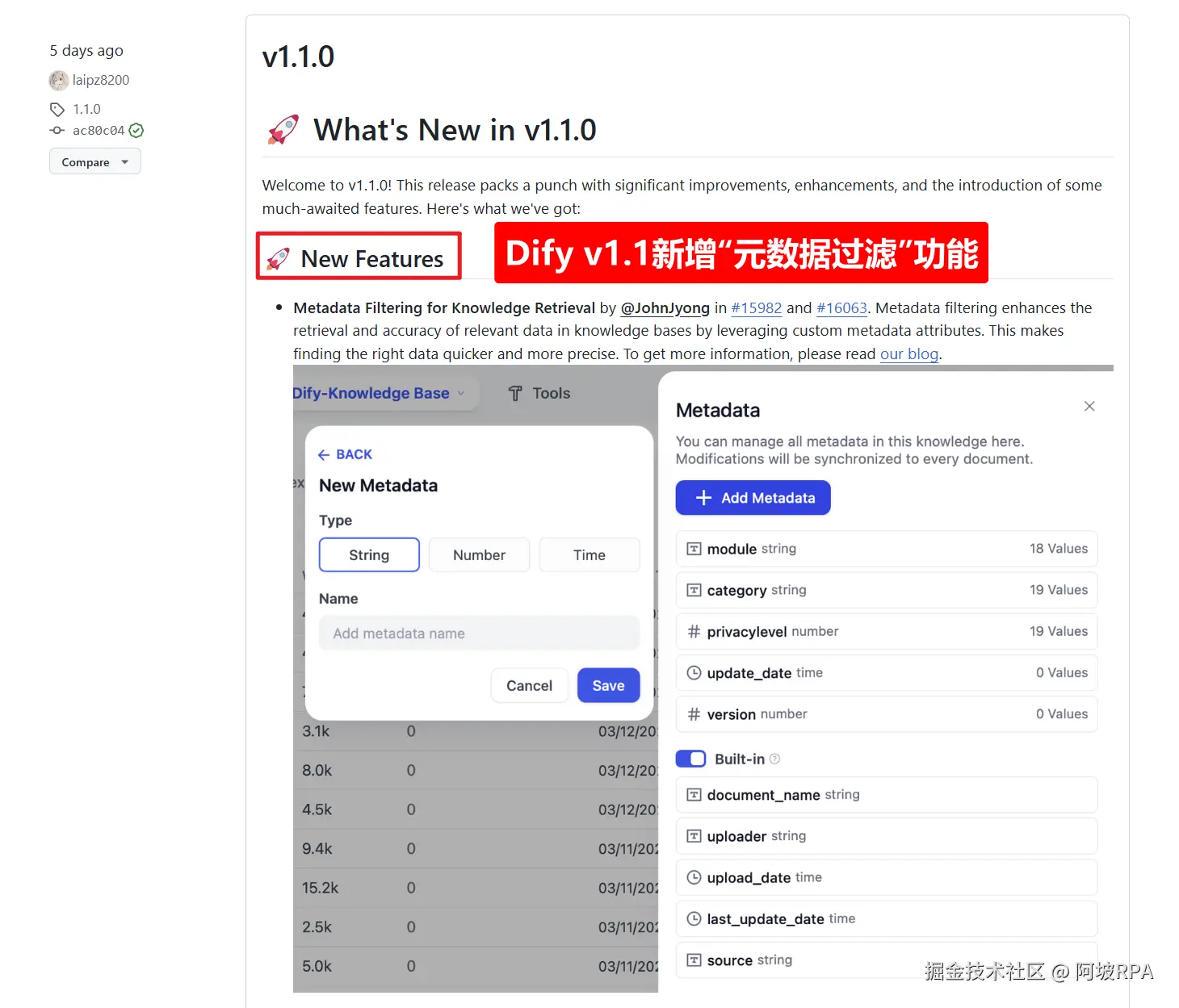 Dify 1.1.0 是继1.0版本发布以来的第一个重大更新版本,除了日常的bug修复和功能迭代之外,还增加了一个重磅功能:元数据过滤。