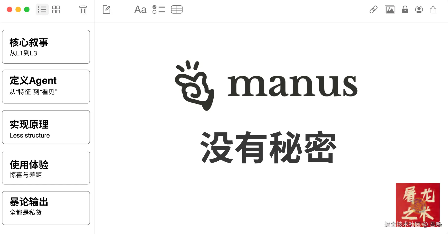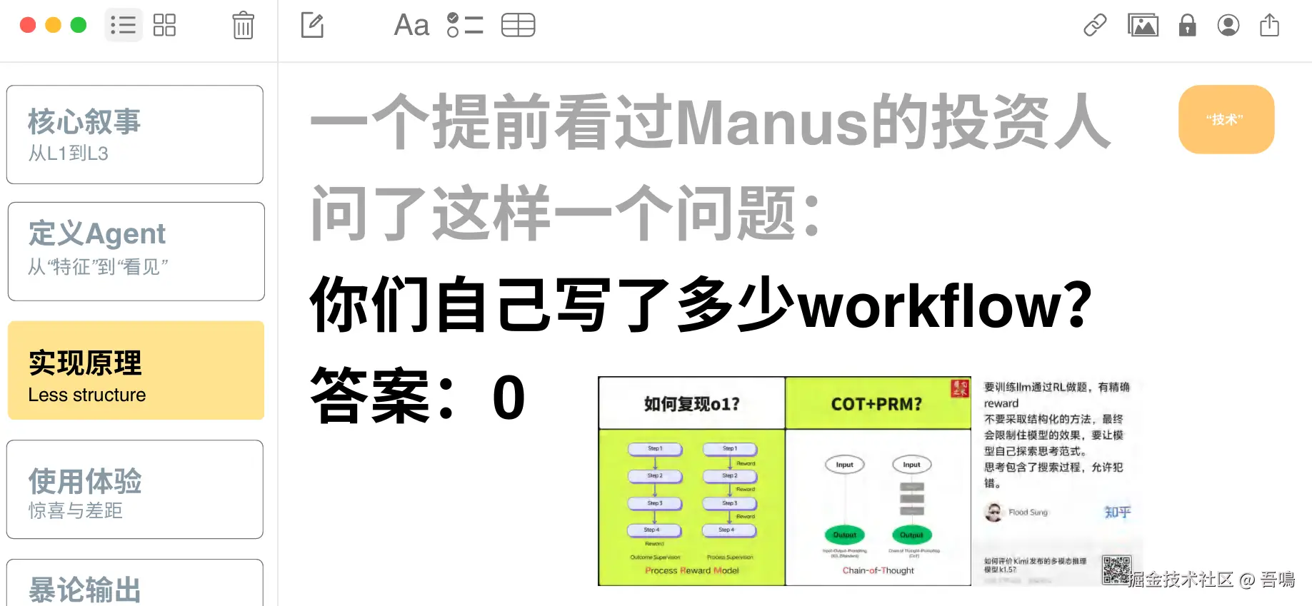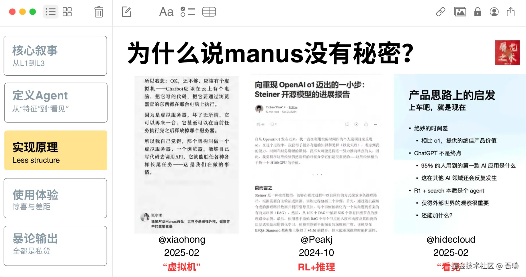 今天吾鳴给大家分享最近很火的AI Agent Manus报告——《Manus没有秘密》。报告一共70页PPT,分别从AI Agent从L1-L3发展过程、Agent的定义与特征、Agent的技术实现原理、使用体验与案例测试、行业现状与挑战、营销与市场反应和未来的展望与反思这几大部分内容展开。文末附上完整版的下载地址,让我们一起来窥探一下Manus的秘密吧。