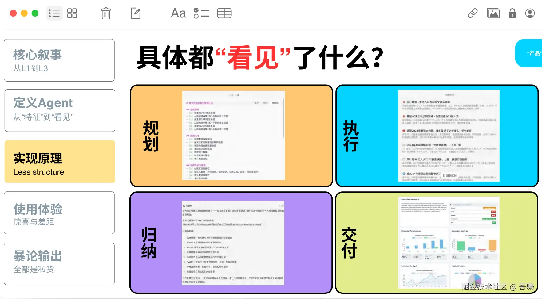 定义AI Agent的核心能力包括规划(Planning)、记忆(Memory)、工具使用(Tools)及多Agent交互。强调Agent从依赖“特征”到让用户直观“看见”过程的转变,以及如何通过技术实现“通用性”(跨领域任务处理)和“傻瓜化操作”(低理解门槛)。 - 技术实现原理