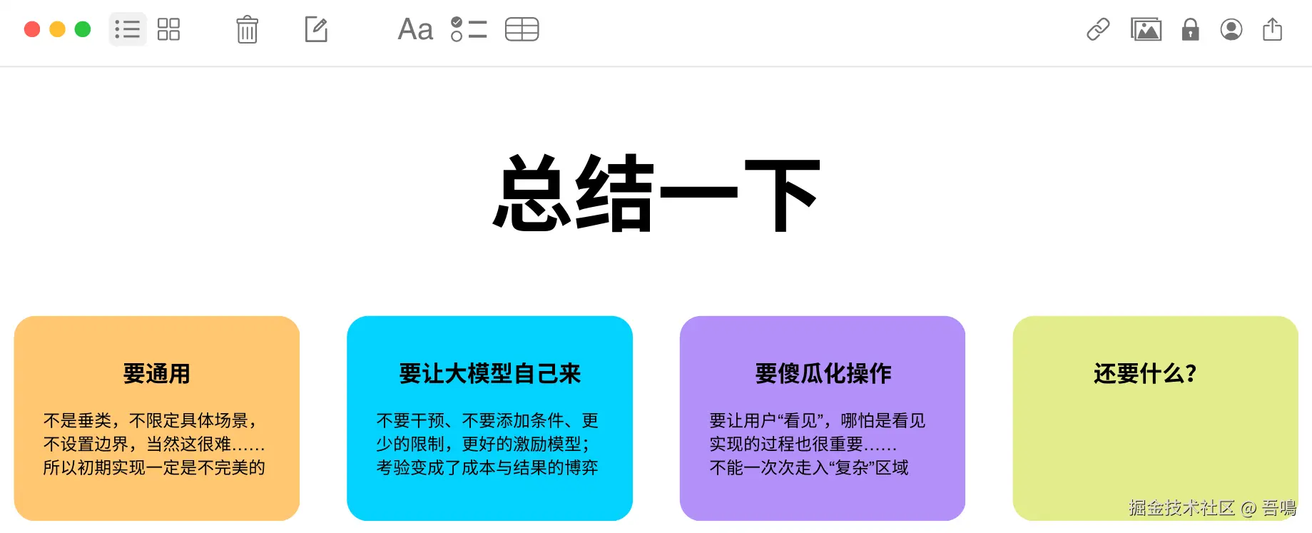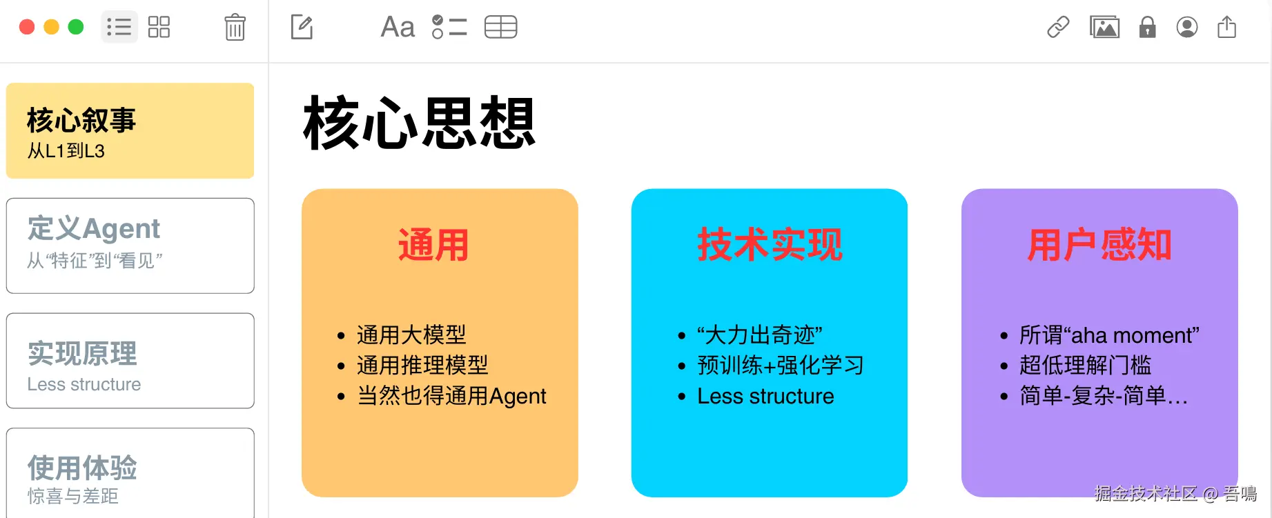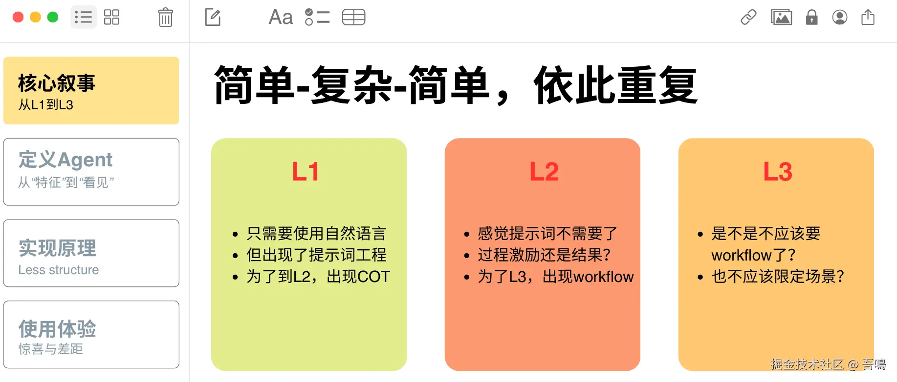 围绕AI Agent从基础(L1)到高级(L3)的演进路径展开,探讨各阶段的技术特征、用户需求变化及实现挑战。例如,L1依赖提示词工程,L2尝试去除结构化限制,L3追求无需预设场景的通用性。重点讨论了模型如何通过“Less structure”减少人为干预,实现自主探索与推理。 - Agent的定义与特征