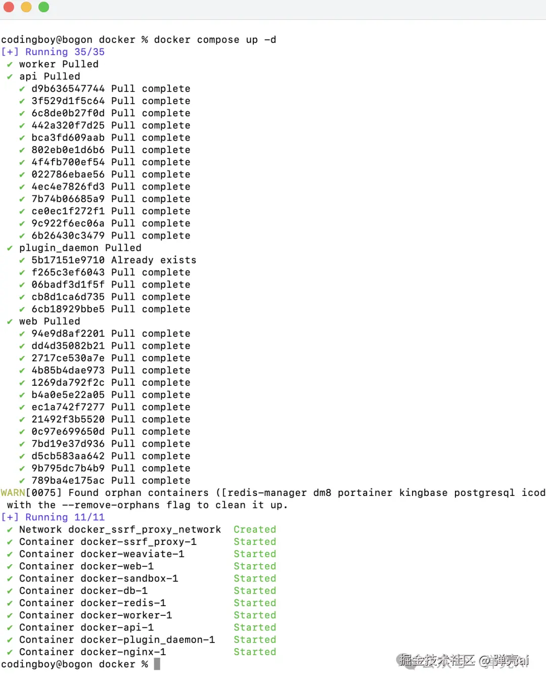 Docker Compose 会自动下载dify最新的镜像,然后启动服务。注意,这一步需要花费的时间可能相对较长,请耐心等待!