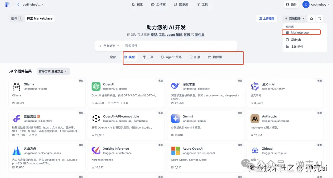 由于工具插件以及模型供应商从1.0.0版本开始都插件化了,所以我们需要按需安装相应的插件,安装完成之后,之前配置的大模型仍然存在。新版本页面中增加插件功能项,点击安装插件,可支持三种安装方式,点击Marktplace,可以看到插件的类型目前有四种,可以按需一键安装,另外也可使用离线安装的方式(更推荐离线本地插件方式)。