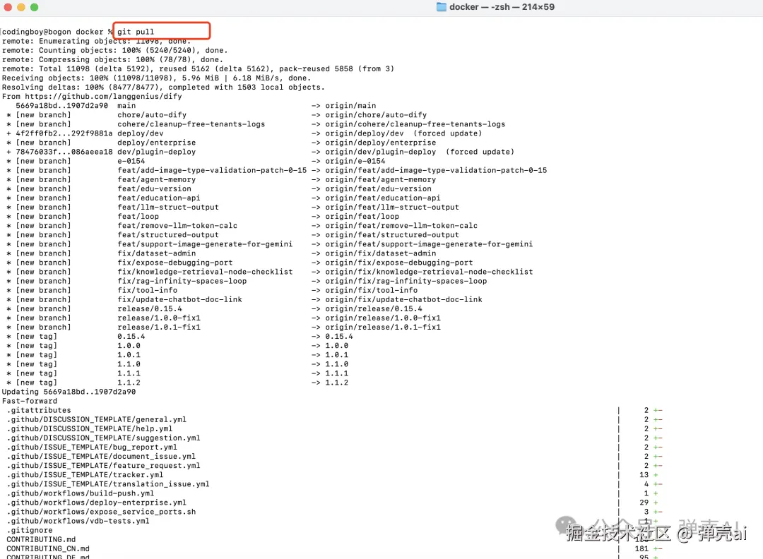 在 Dify 项目路径下,运行以下命令来拉取最新的代码。