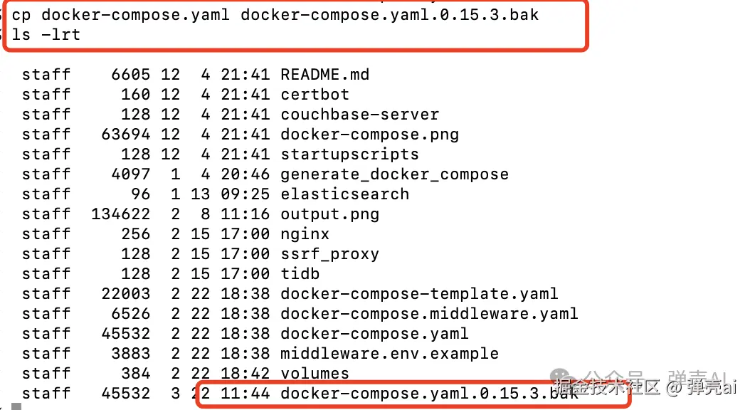 进入 Dify 项目路径下的 docker 文件夹,备份 docker-compose.yaml文件,这个文件包含了服务编排配置信息。