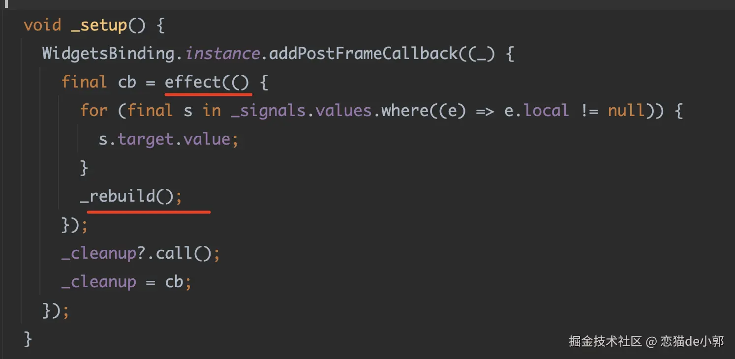 所以可以看到,其实 signals 虽然在 Flutter 还是会需要到 context ,但是依赖程度很低,并且支持程度也很多样,有通过 effect 的,也有通过 computed 的,当然最终触发 UI 变化的时候,本质还是要回归到 setState 。