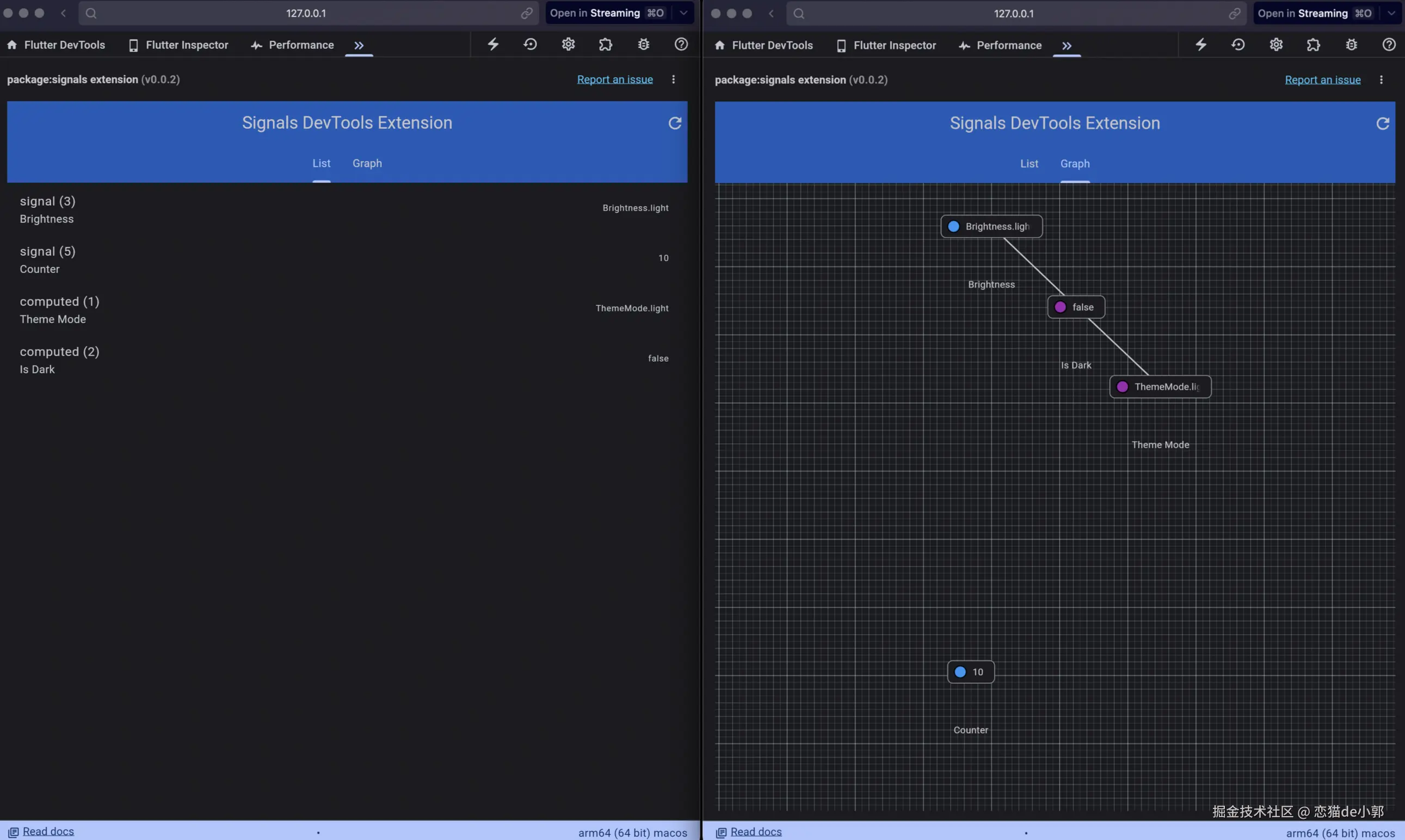 从这里你也可以看到 signals 和 Flutter 之间的一个关系,signals 是一种数据跟踪和管理模式,而如何更新 Flutter UI ,就看你的颗粒度和使用需要,最方便的肯定是直接采用前面介绍的 API 。