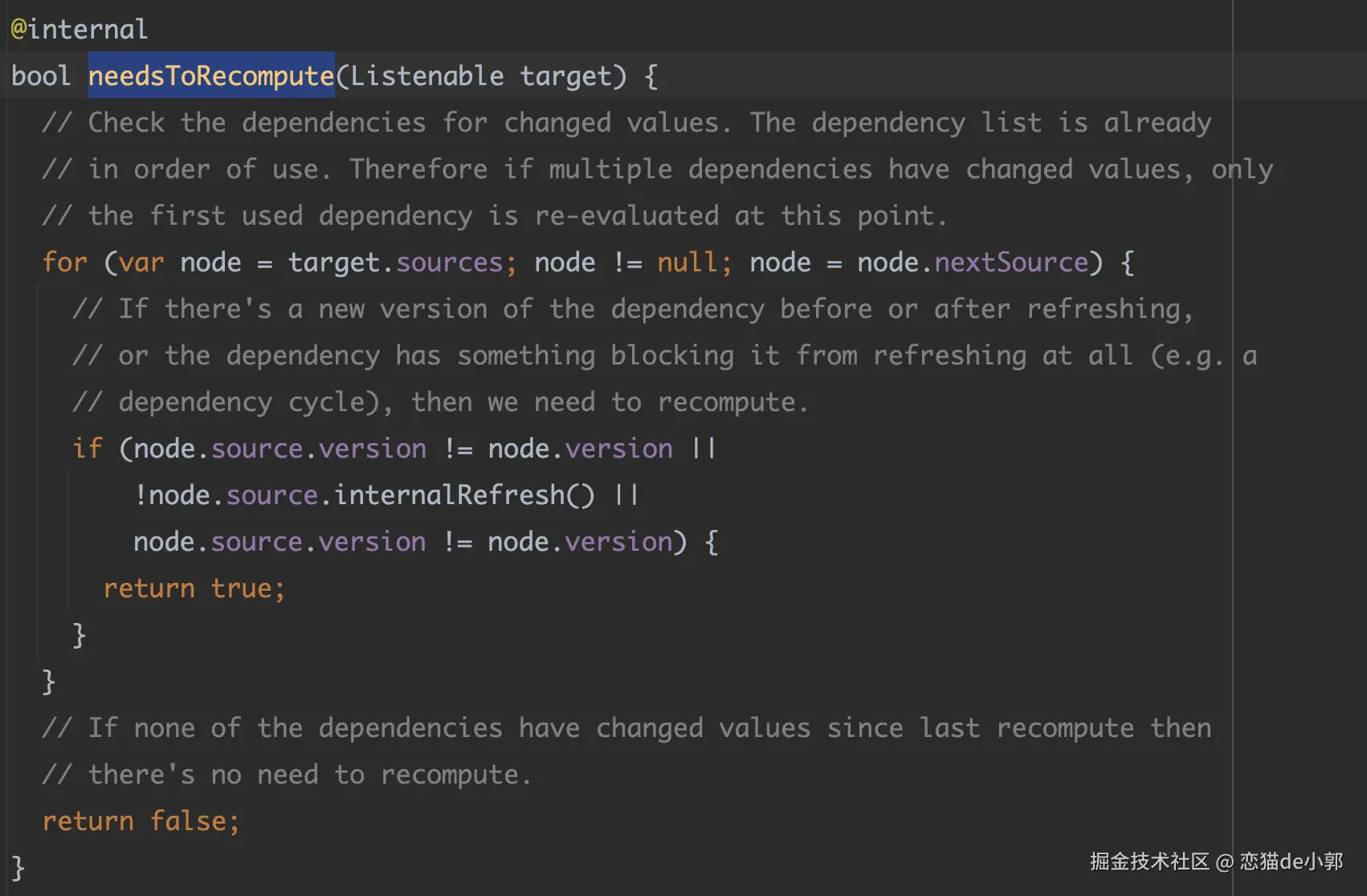 internalRefresh 其实就是一个判断是否需要更新的过程,比如用到前面的 needsToRecompute 会分析所有依赖项的 source version ,从而判断是否需要更新,还有 evalContext = this 切换到当前执行环境: