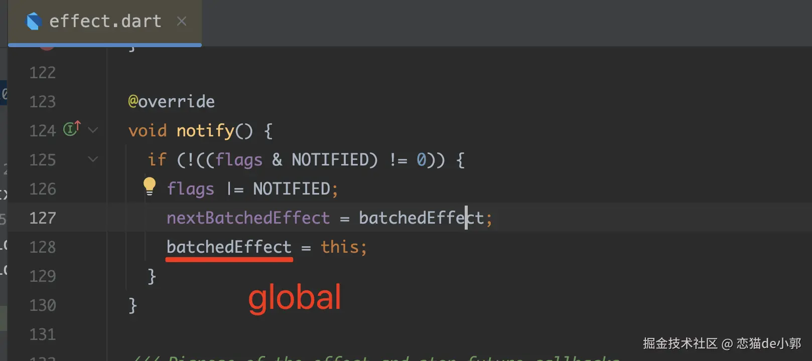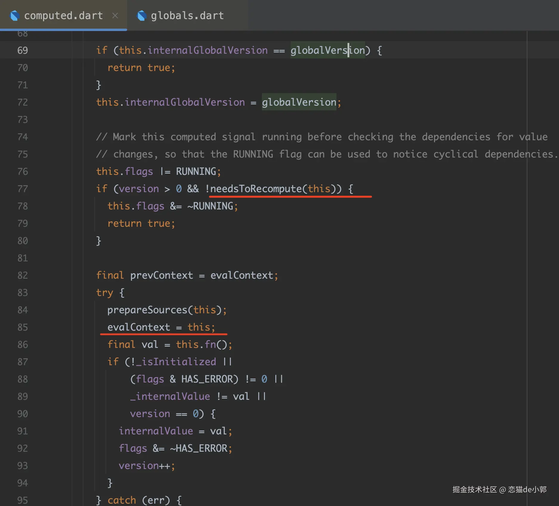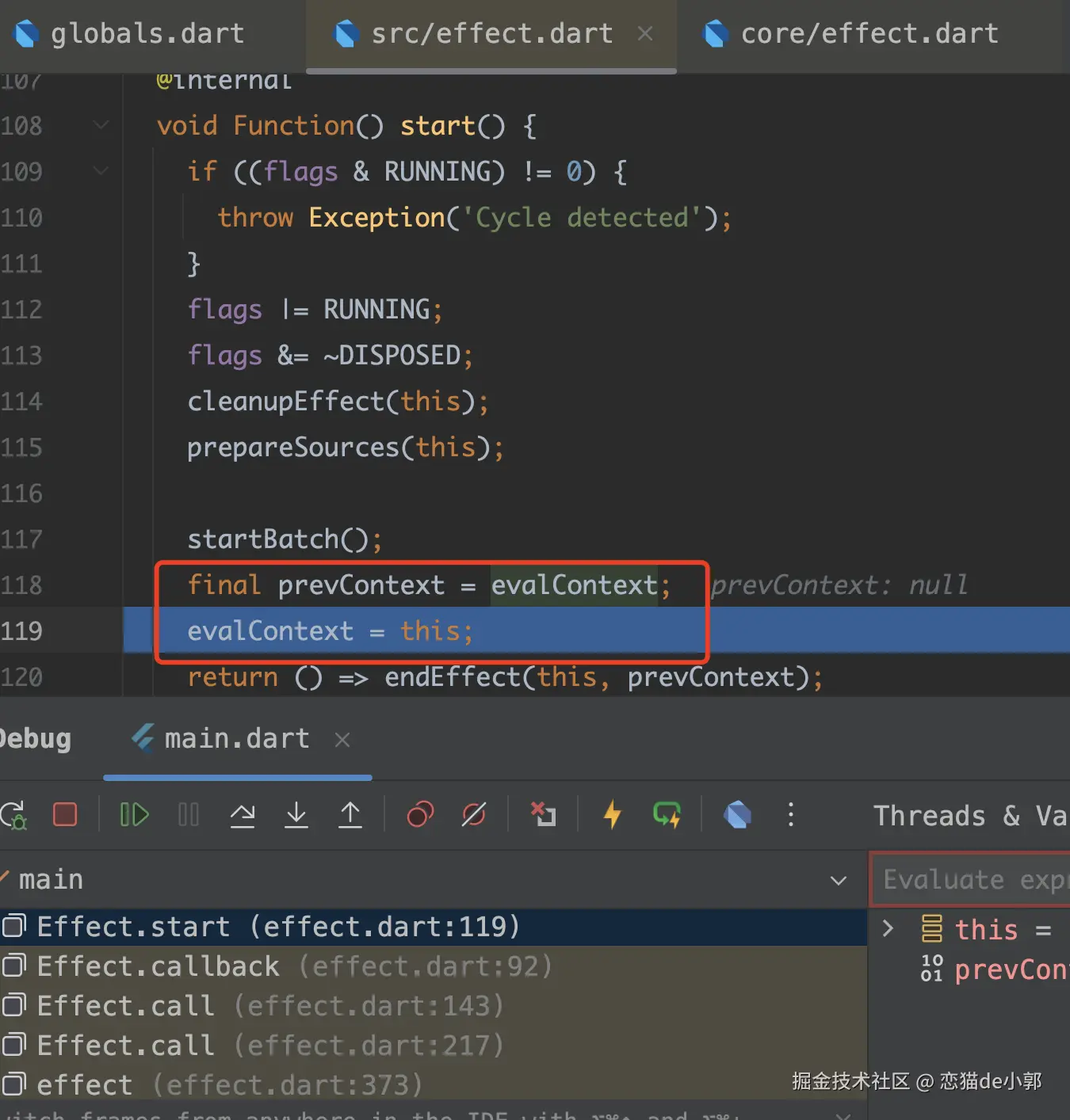 这里的 evalContext 其实就是 Computed / Effect 的抽象上下文,它代表的是当前的执行环境,它是存在于 global.dart 里的全局变量,决定当前执行的上下文环境, evalContext = this 大概意思就是 :