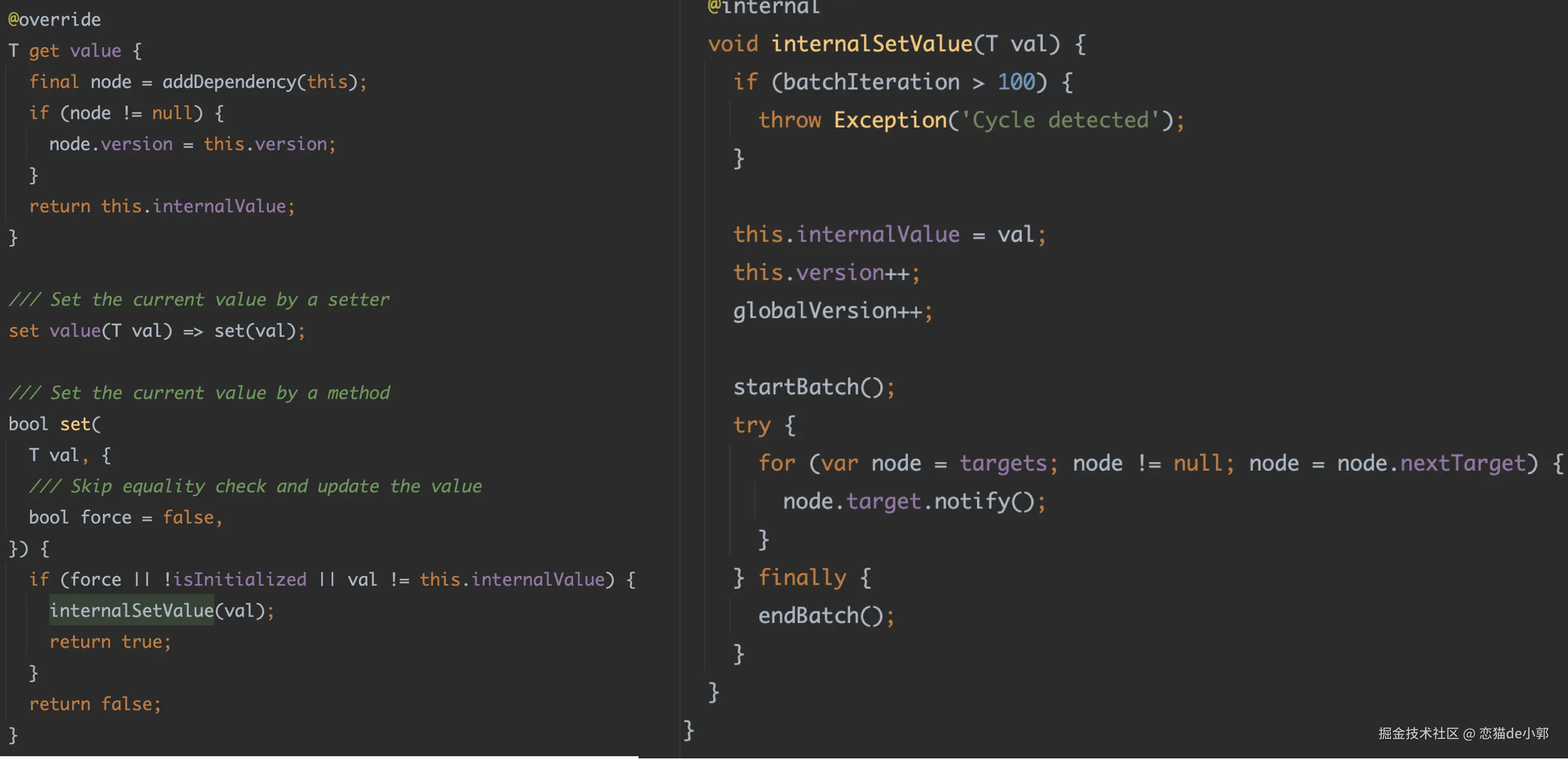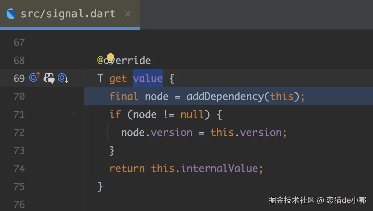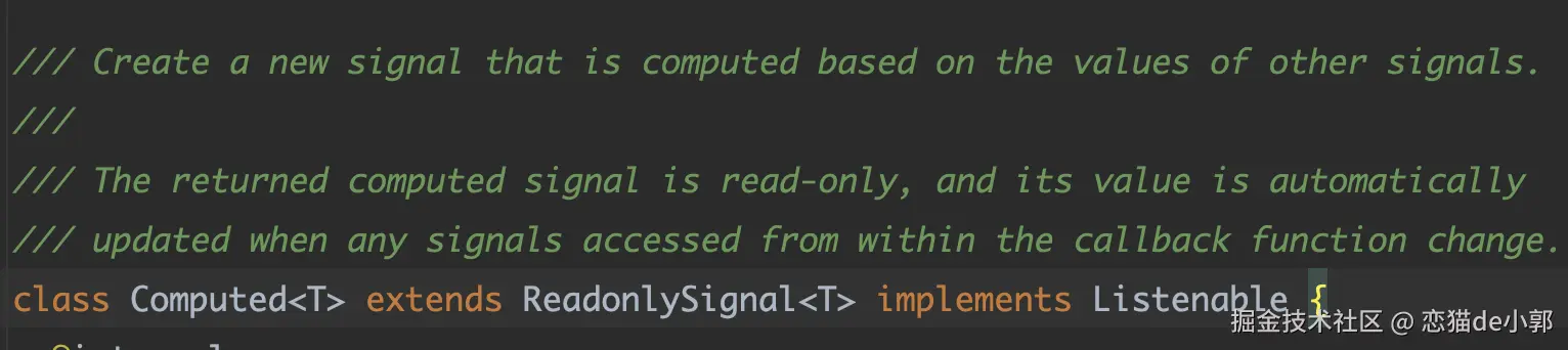 所以在 signals.dart 的源码和资料里都能看到它们的身影,而事实上 signals.dart 的实现就深受 Preact Signals 的影响,比如最底层的基础代码结构上: