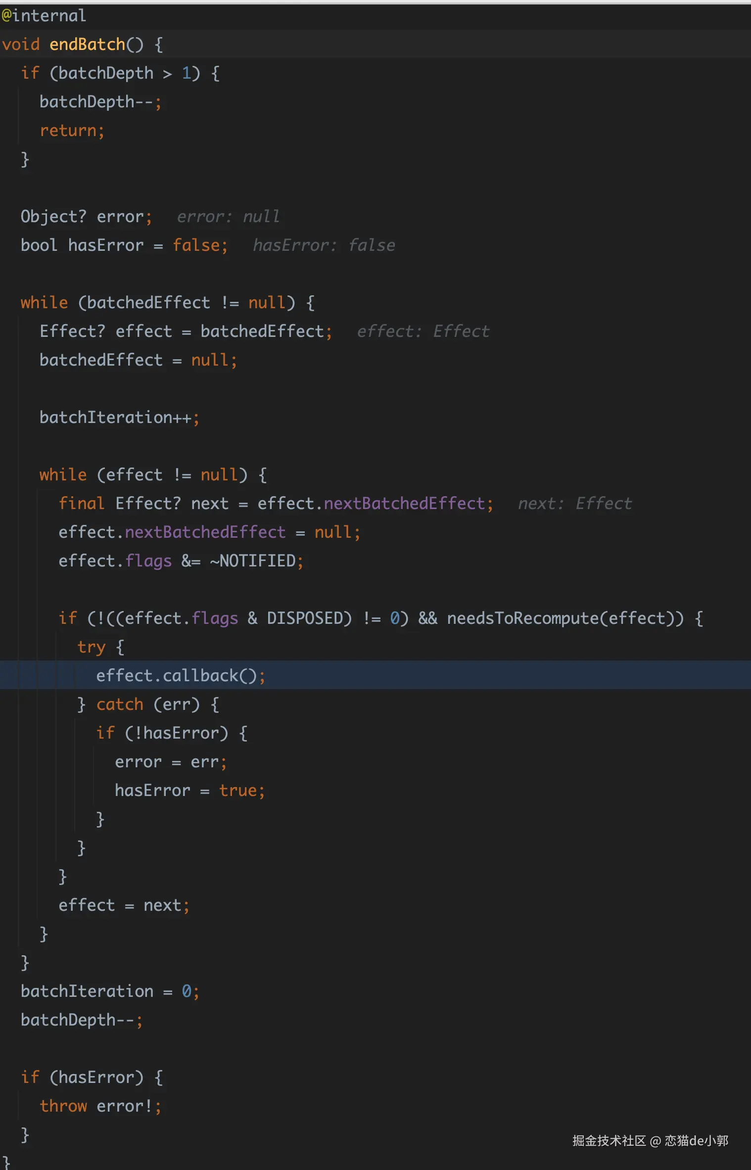 而最终通过 endBatch 执行批处理,执行就会触发对应的 Effect 的 callback,进而再次执行到我们需要让他消费的地方,也就是 effect 里的函数因为 value 改变被再次执行: