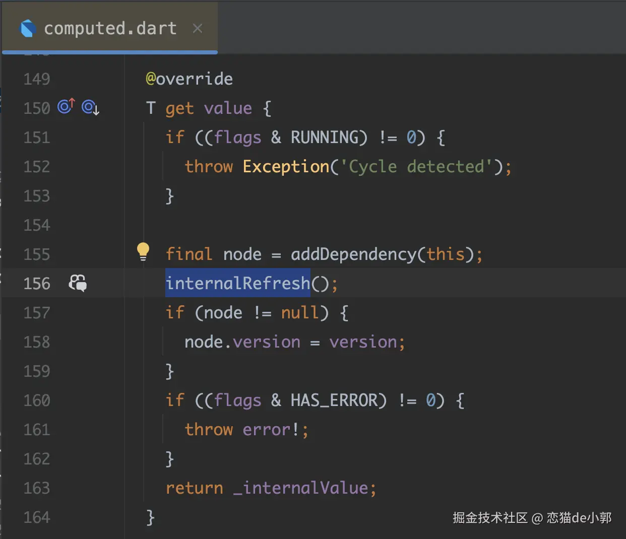 那么对于 Computed 来说也类似,不同的是 Computed 也是一个「特殊信号」,在获取它的 value 的时候同样会添加依赖,只是这里会有多一步 internalRefresh 操作: