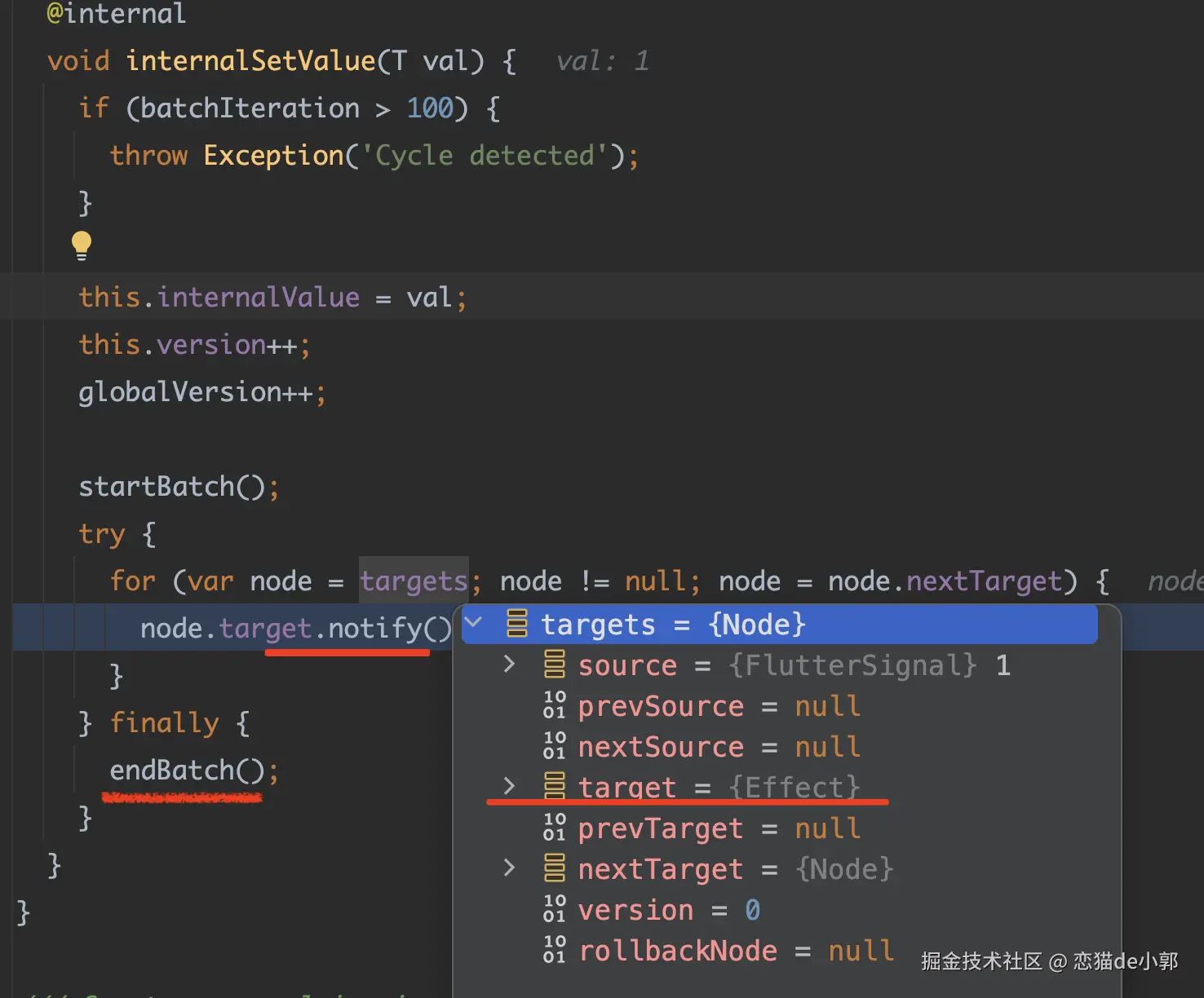 所以在 signals 里,会利用 Node 对象来通知存储在 targets 列表中的所有依赖者 ,当信号的值发生改变时,会遍历依赖者列表,并根据 _version 对比结果来触发更新。