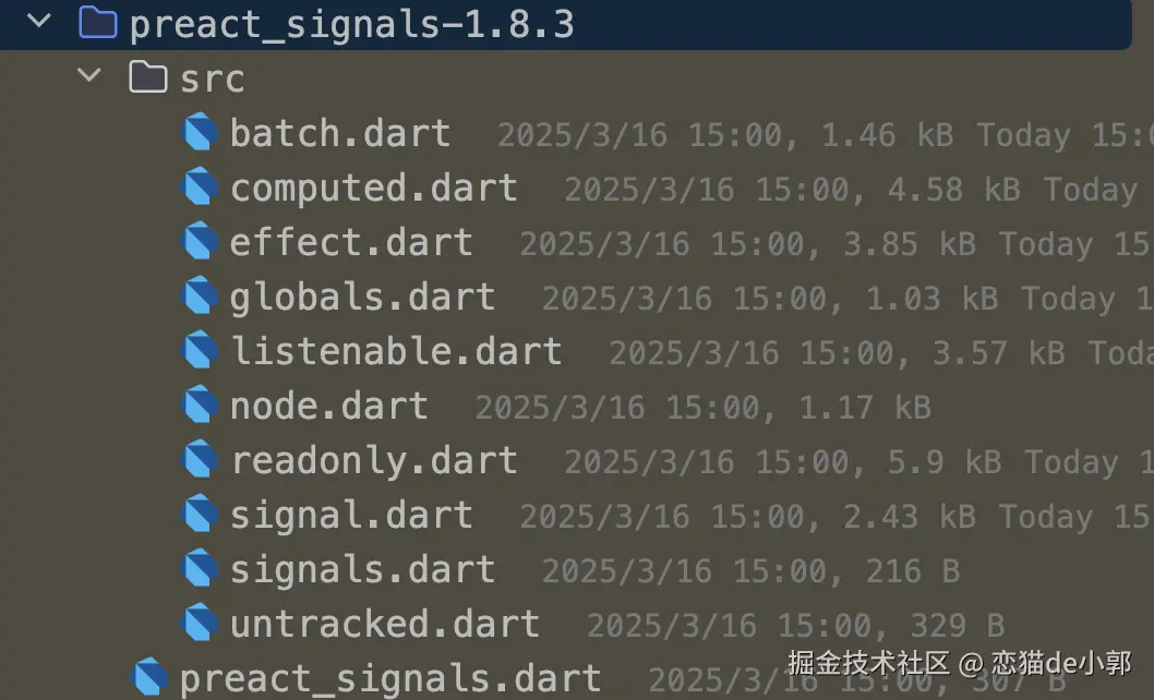 首先需要说明一点,「Signals」 是业内通用的一种状态管理模式,而 signals.dart 项目就是 Preact Signals 的一个 Dart 移植版本,所以在最底层源码里你可以看到 Preact Signals 的核心原语,自然也就是包含了 Signal 的细粒度、惰性求值和自动依赖追踪等能力。