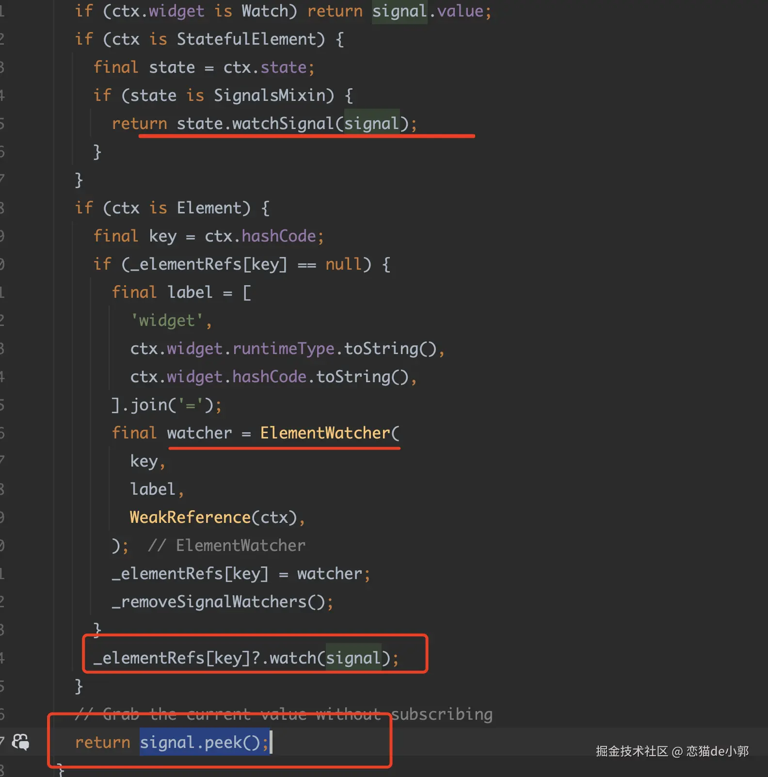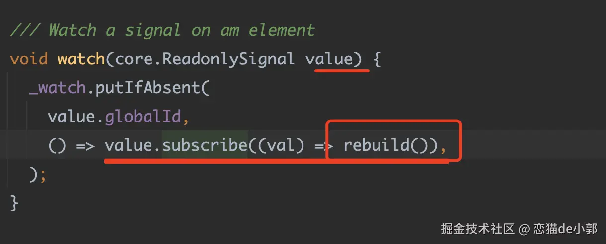 而实际 watch 其实就是让 value 再变化时通过 subscribe 触发 rebuild ,另外这里它会使用 signal.peek() 来避免 value 调用时的 subscribing 监听。