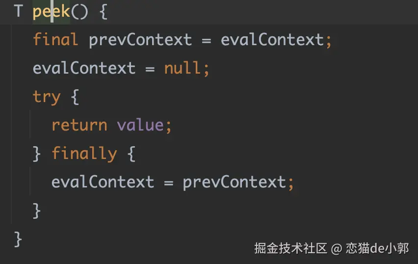 而 peek() 之所以不会被跟踪依赖,其实就是在返回 value 之前,先临时清空了 evalContext ,也就是没有执行环境了: