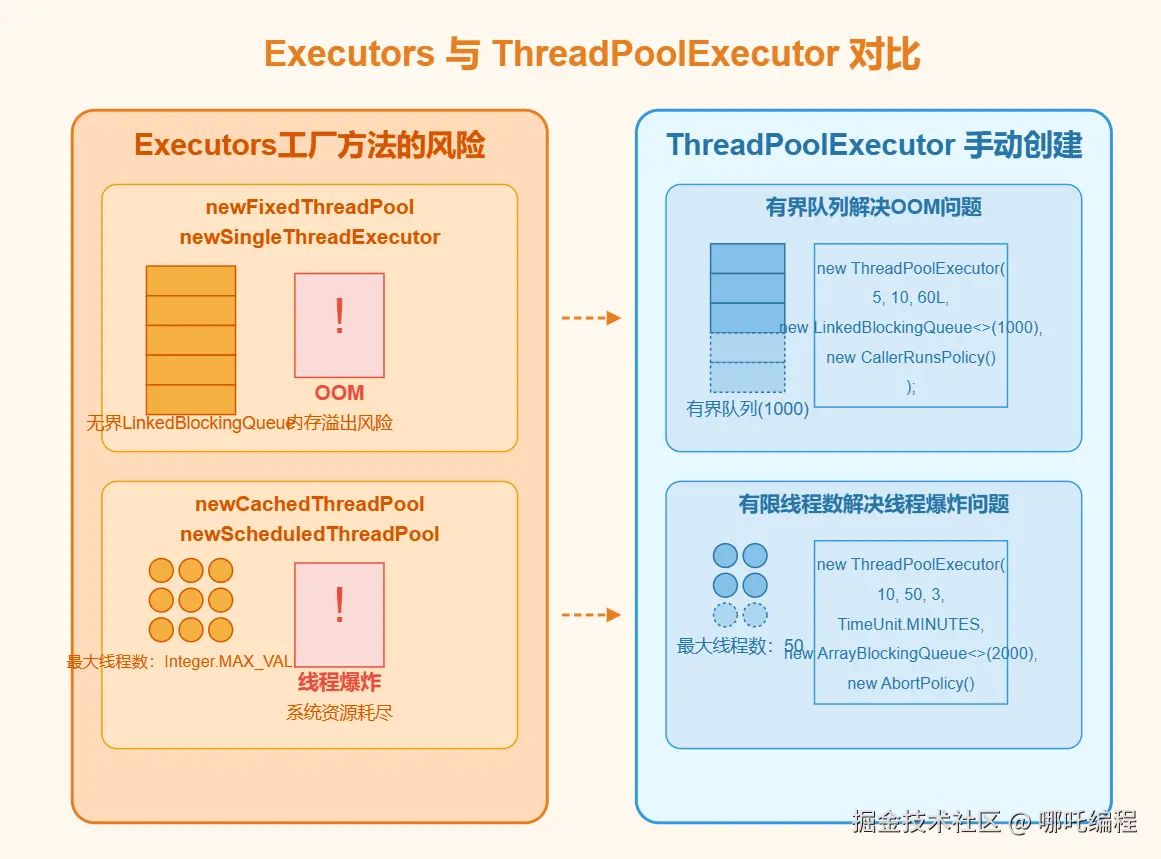 明确指定线程数上限和任务队列容量,避免资源耗尽。防止OOM(内存溢出)和线程爆炸问题,系统资源使用更加可预测和稳定。