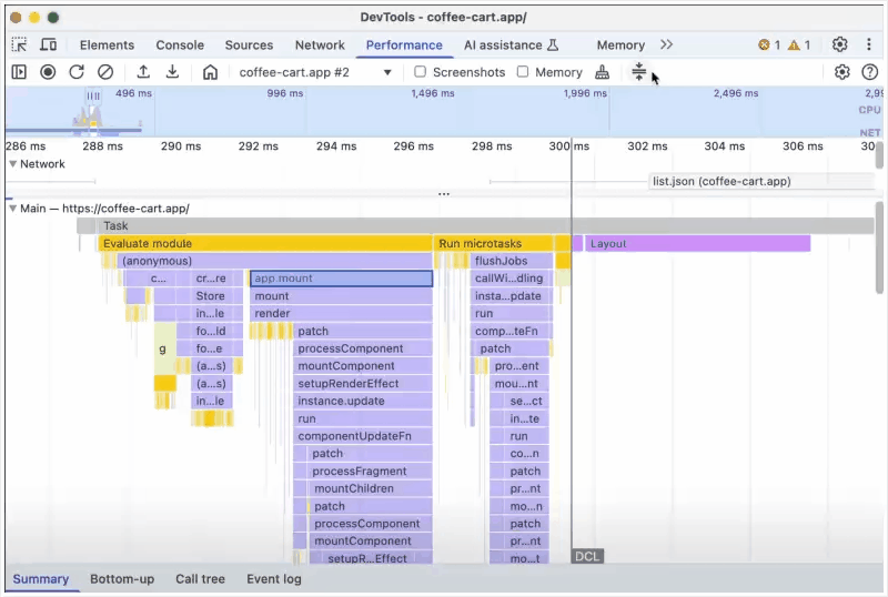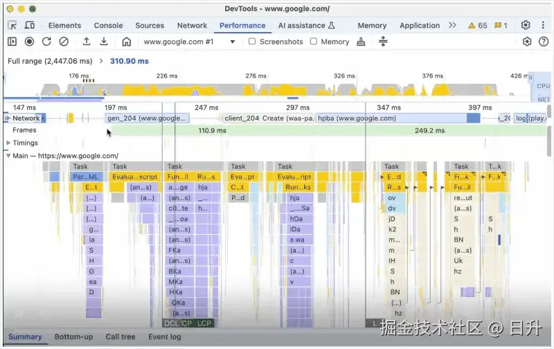 Performance > Summary 选项卡会显示 JavaScript 调用的堆栈跟踪,包括异步调用。