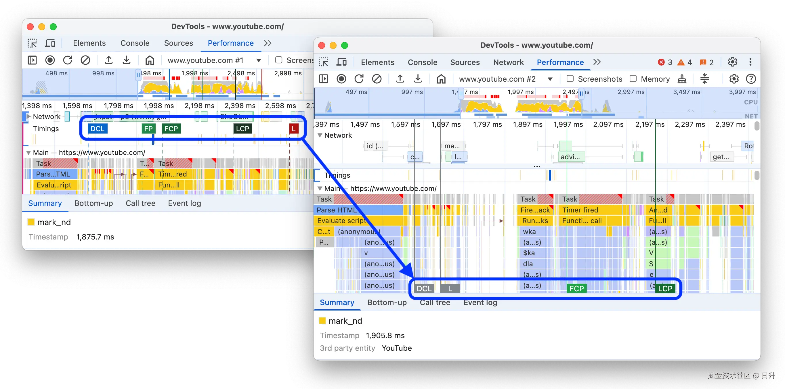 Timings track 保留了自定义的 mark() 和 measure() 调用。