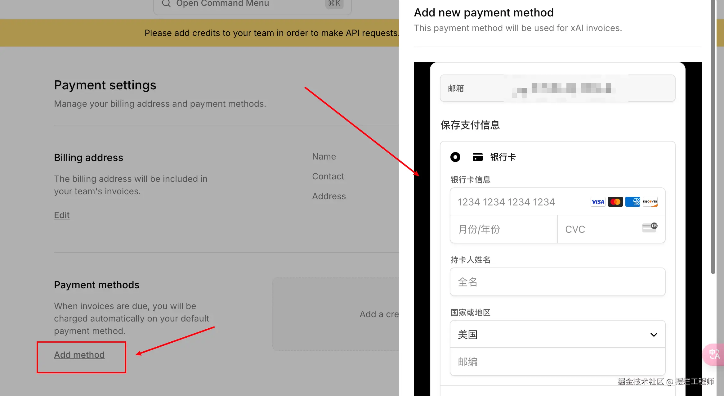 打开 Grok API 平台:“console.x.ai” 按下面,找到 “Payment settings” 进行 填写账单地址,然后再添加卡。