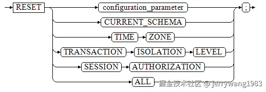 RESET {configuration_parameter | CURRENT_SCHEMA | TIME ZONE | TRANSACTION ISOLATION LEVEL | SESSION AUTHORIZATION | ALL };