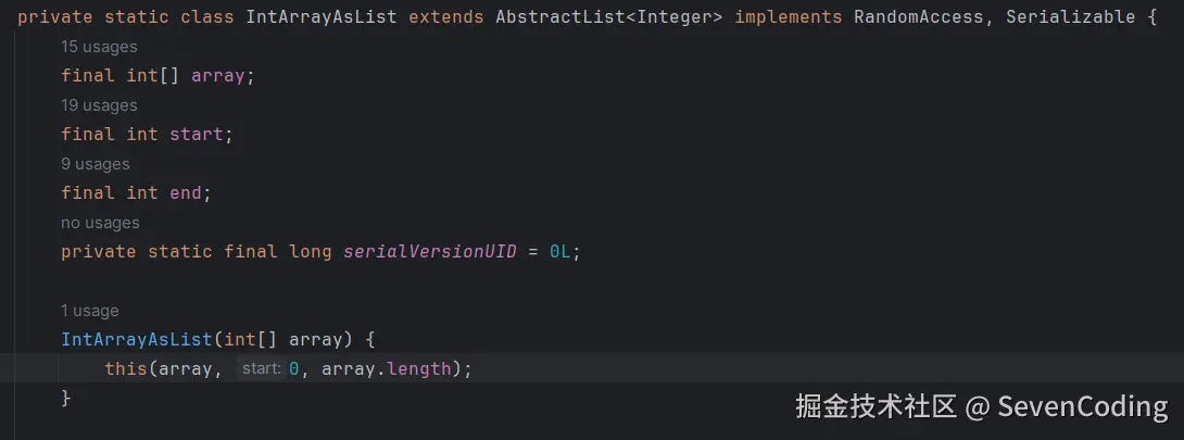 由源码可以看到,如果传入的参数长度为0,那么就会创建一个Collections.emptyList(),如果参数长度不为0,那么就会创建一个Ints的内部类IntArrayAsList。