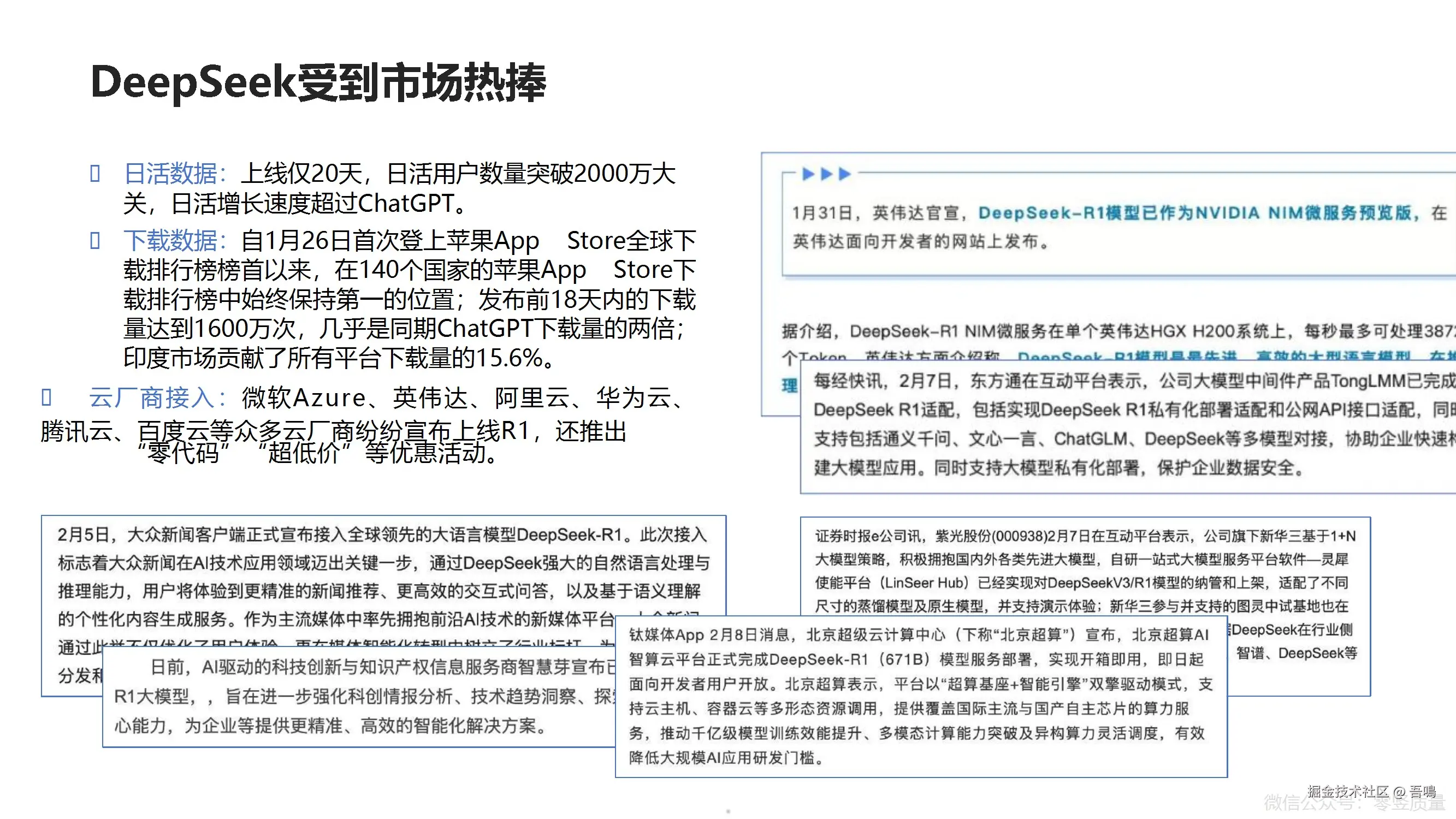 介绍了DeepSeek的核心产品DeepSeek-R1,其性能对标OpenAI,支持网页端、APP和API,强调开源策略(MIT协议)及低成本优势。模型通过强化学习技术优化推理能力,在数学、代码和自然语言任务中表现优异,日活用户迅速突破2000万,并在全球多国下载量领先。 - 技术特点与模型对比