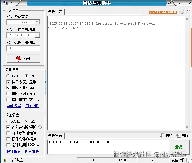 那么接下来,我们打开网络调试助手去连接PLC,看看能不能连接上。